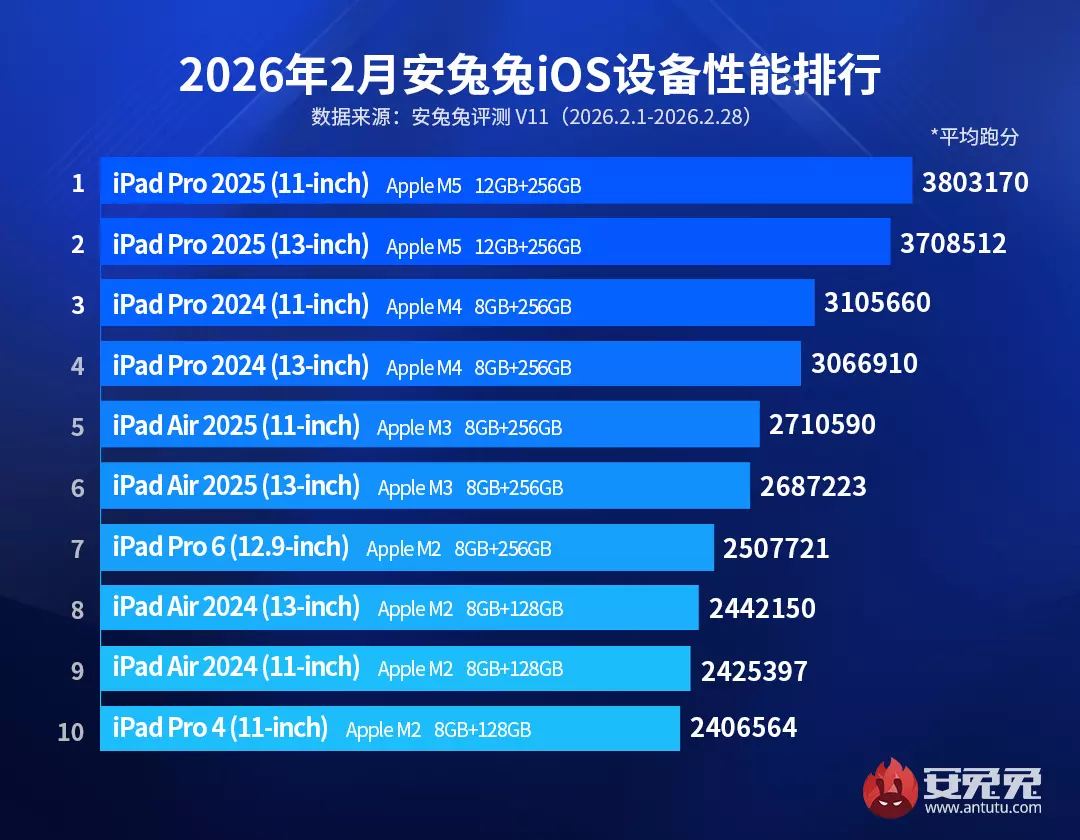 如果用一句话来评价2月iOS设备性能榜,那就是「毫无亮点」。对比上月,只是第五名(iPad Air 2025 13-inch)和第六名(iPad Air 2025 11-inch)的位置互换,其他名次均无任何变化。 不过,等到了3月4日,苹果将更新一大波硬件新品,包括新款MacBook、新款iPad、iPhone 17e等。俗话说得好,「暴风雨来临之前海面总是格外平静」。也就是说,虽然2月份的iOS设备性能榜过于平淡,但是相信3月份的新品,能够为榜单注入新的活力。俗话说得好,「暴风雨来临之前海面总是格外平静」。