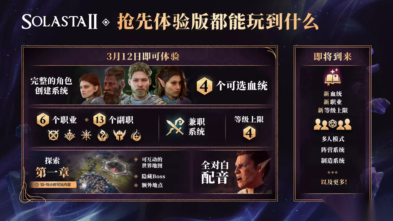 《索拉斯塔2》不仅将保留前作备受赞誉的战斗系统,致力于为全世界玩家带来原汁原味的桌游体验。同时也会重点加强游戏整体的视觉效果以及叙事水准,在UE5引擎加持下,本作的画面质量和演出体验相比前作将迎来巨幅的提升。而在抢先体验版上线初期,玩家将能体验到: