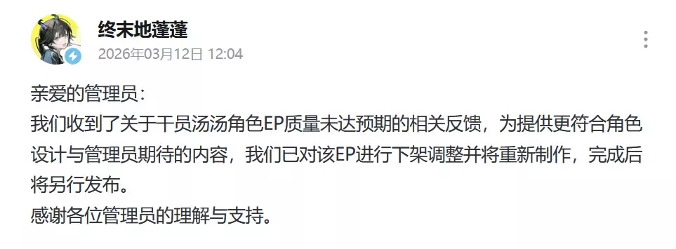 昨日,《明日方舟:终末地》官方运营认证账号(哔哩哔哩),发布公告(汤汤角色EP下架事件)。 亲爱的管理员: 我们收到了关于干员汤汤角色EP质量未达预期的相关反馈,为提供更符合角色设计与管理员期待的内容,我们已对该EP进行下架调整并将重新制作,完成后将另行发布。 感谢各位管理员的理解与支持。