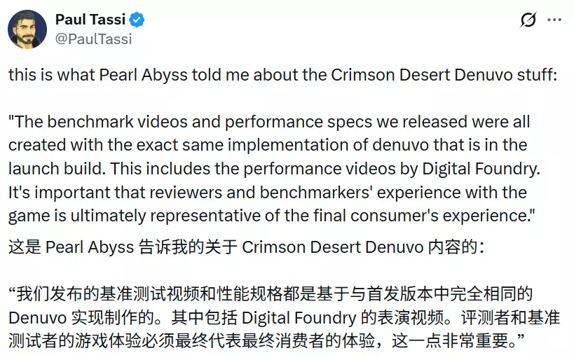 据保罗·塔西在X平台上分享的信息,珍艾碧丝声称Denuvo的加入对游戏性能没有产生负面影响,目前公布的所有性能指标均是在已搭载Denuvo的游戏版本上测试得出的。 “我们发布的基准测试视频和性能规格,均与发售版本中完全相同的Denuvo实现方式下创建。这包括Digital Foundry发布的性能测试视频。确保评测者和基准测试者的游戏体验最终能代表消费者的实际体验,这一点至关重要。”