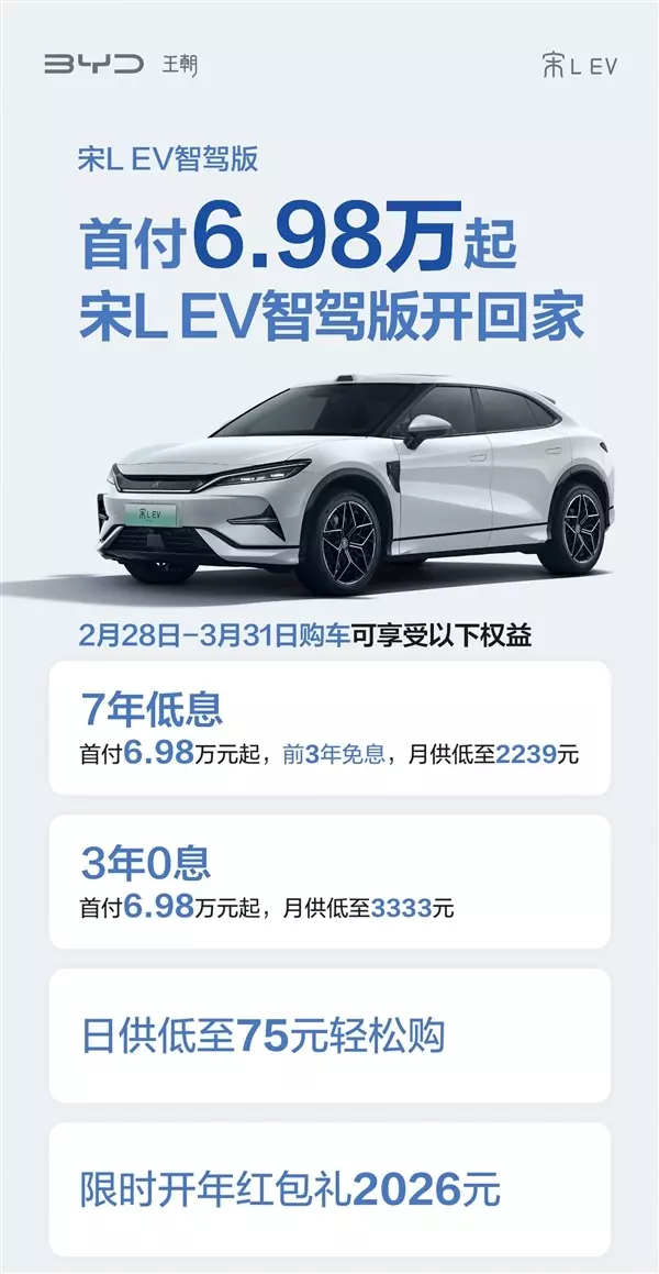 宋L EV智驾版 首付6.98万起,7年低息:首付6.98万元起,前3年免息,月供低至2239元;3年0息,首付6.98万元起,月供低至3333元,以及限时开年红包礼2026元。