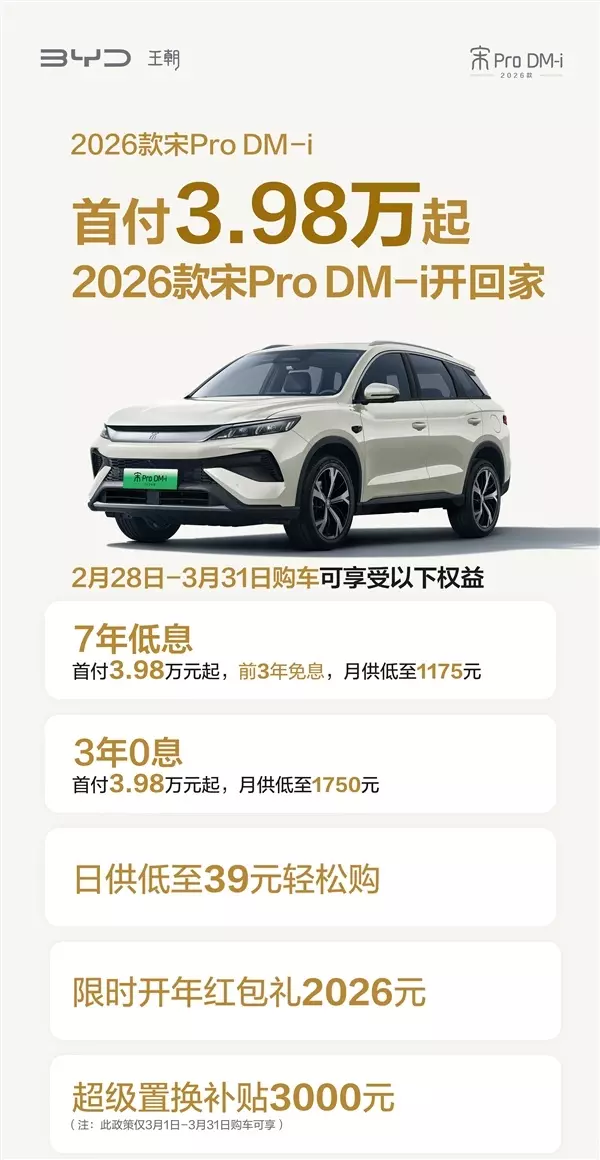 2026款宋Pro DM-i: 7 年低息:首付3.98万起,前3年免息,月供1175元;3年0息:首付3.98万起,月供1750元;限时开年红包礼2026元,超级置换补贴3000元(注:此政策仅3月1日-3月31日购车可享)。