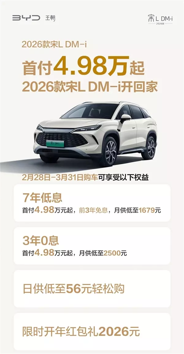 2026款宋L DM-i: 首付4.98万起,7年低息,首付4.98万元起,前3年免息,月供低至1679元;3年0息,首付4.98万元起,月供低至2500元,以及限时开年红包礼2026元。