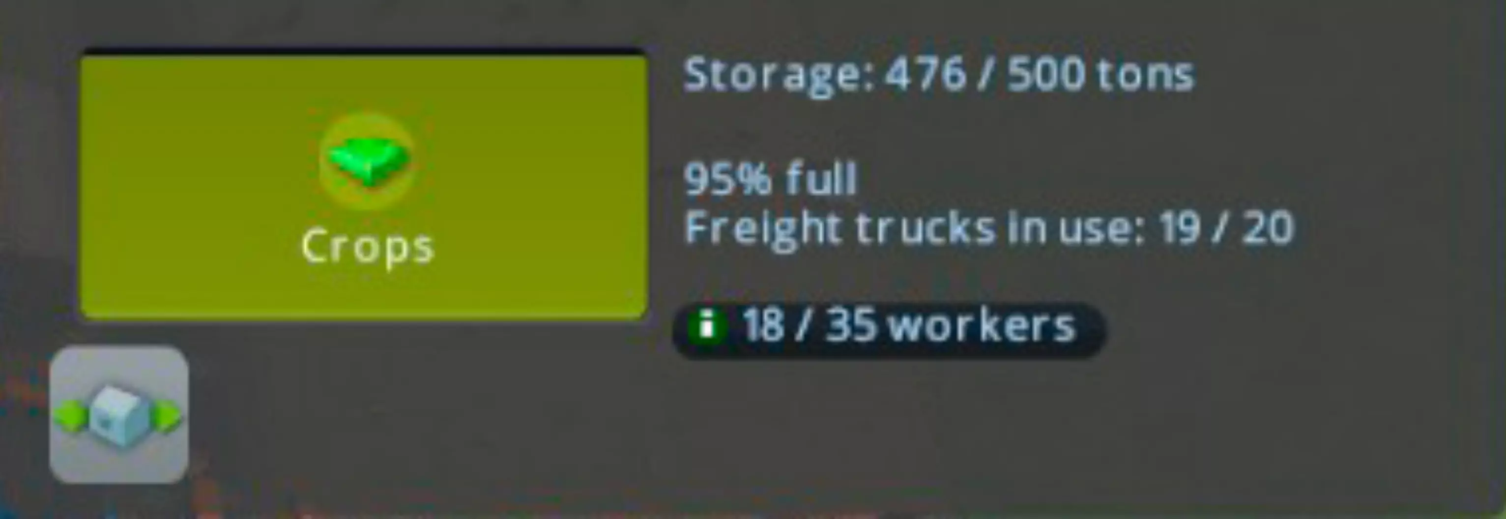 如果您的城市中没有仓储建筑,那么您的资源采集设施会缓慢填满其内部存储空间,一旦达到上限,就会派出一辆卡车。运气好的话,此时您城市中的某个加工厂正好需要该资源,卡车就会前往那里;但大多数情况下,事情不会这么顺利。当卡车无需排队时,您的资源采集设施会抱怨其产品缺乏买家。这与加工厂抱怨资源不足的情况类似:加工厂发出需求的时间要么太早,要么资源采集设施还没准备好。等待需求最终会由采集设施满足,届时采集设施会暂时处于正常状态,但你往往需要同时处理两组建筑的问题。 这就是仓储设施发挥缓冲作用的时候了。当有仓储建筑用于存放和调配资源时,采集设施和加工设施的时间安排是否完全一致就无关紧要了。这正是仓储设施如此宝贵的原因——工业和商业领域也是如此,在有分区产品的情况下,它们的运作方式完全相同。 尽管有仓储设施仍有投诉! 但我的城市里即使有仓储设施,还是总有投诉! 别担心,我也遇到过这种情况。这是非常正常的现象,是由存储空间不足导致的。 你可能会生产大量资源,以至于所有的存储建筑都或多或少被填满了。 如果出现这种情况,你还会发现所有卡车几乎都在不停地工作——存储建筑会尝试将资源数量恢复到其目标范围内。