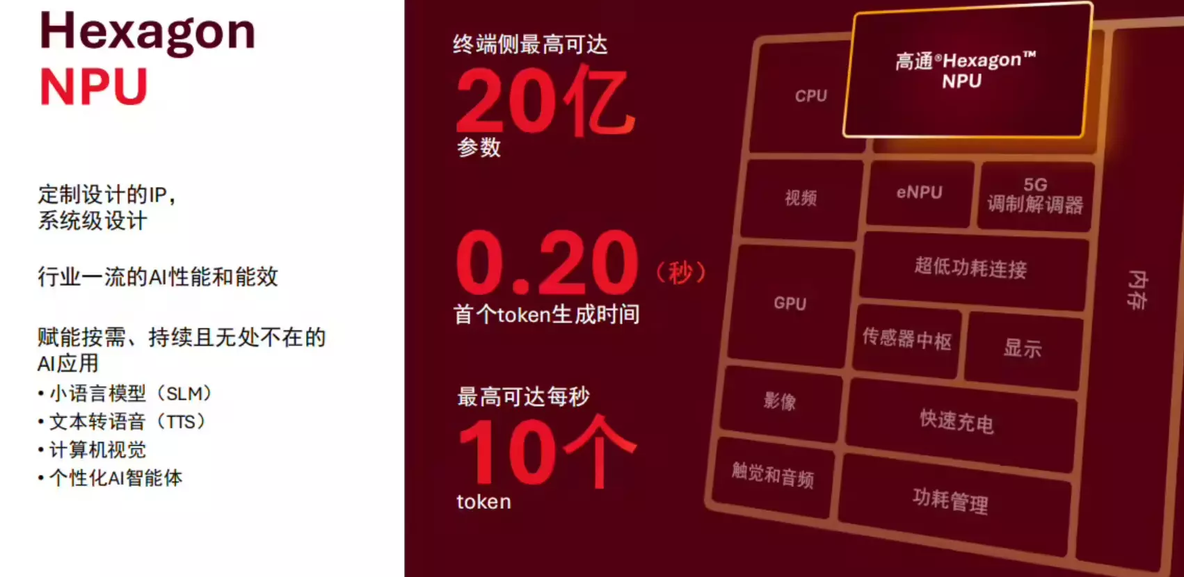 根据高通介绍,骁龙Waer Elite首次引入了专用NPU,实现了端侧运行至高20亿参数的模型,首个token生成时间缩减到0.2秒,最高可达每秒10个token,让AI模型向更小型化、高效化的方向发展。
