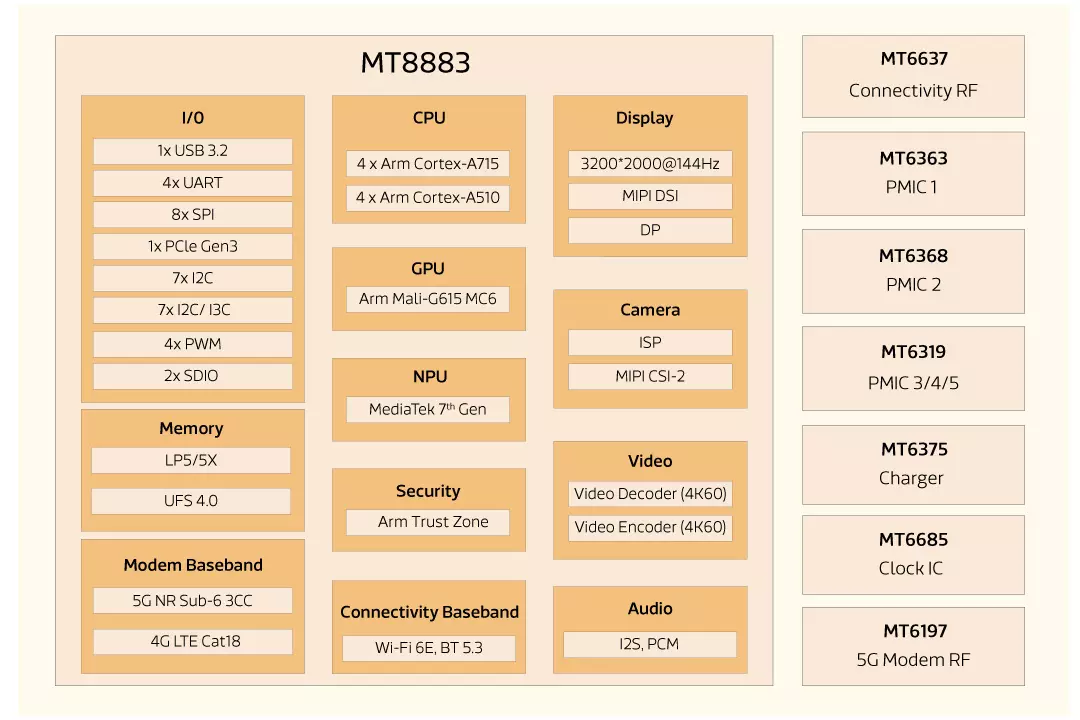 据悉,Clicks采取的MT8883芯片是2023年末发布的联发科天玑8300特定变体版本,采用4nm制程,包含1个Cortex-A715主核、3个Cortex-A715性能核以及4个Cortex-A510能效核,配备Arm Mali-G615 MC6 GPU。