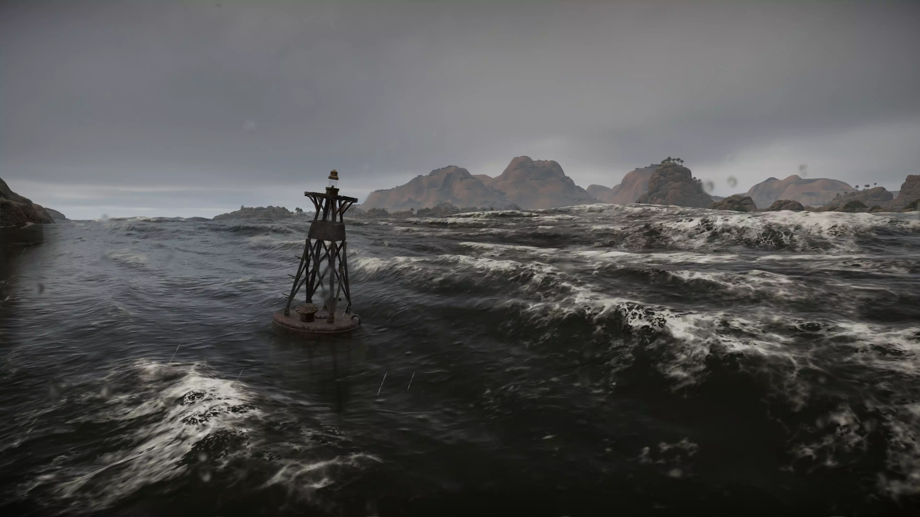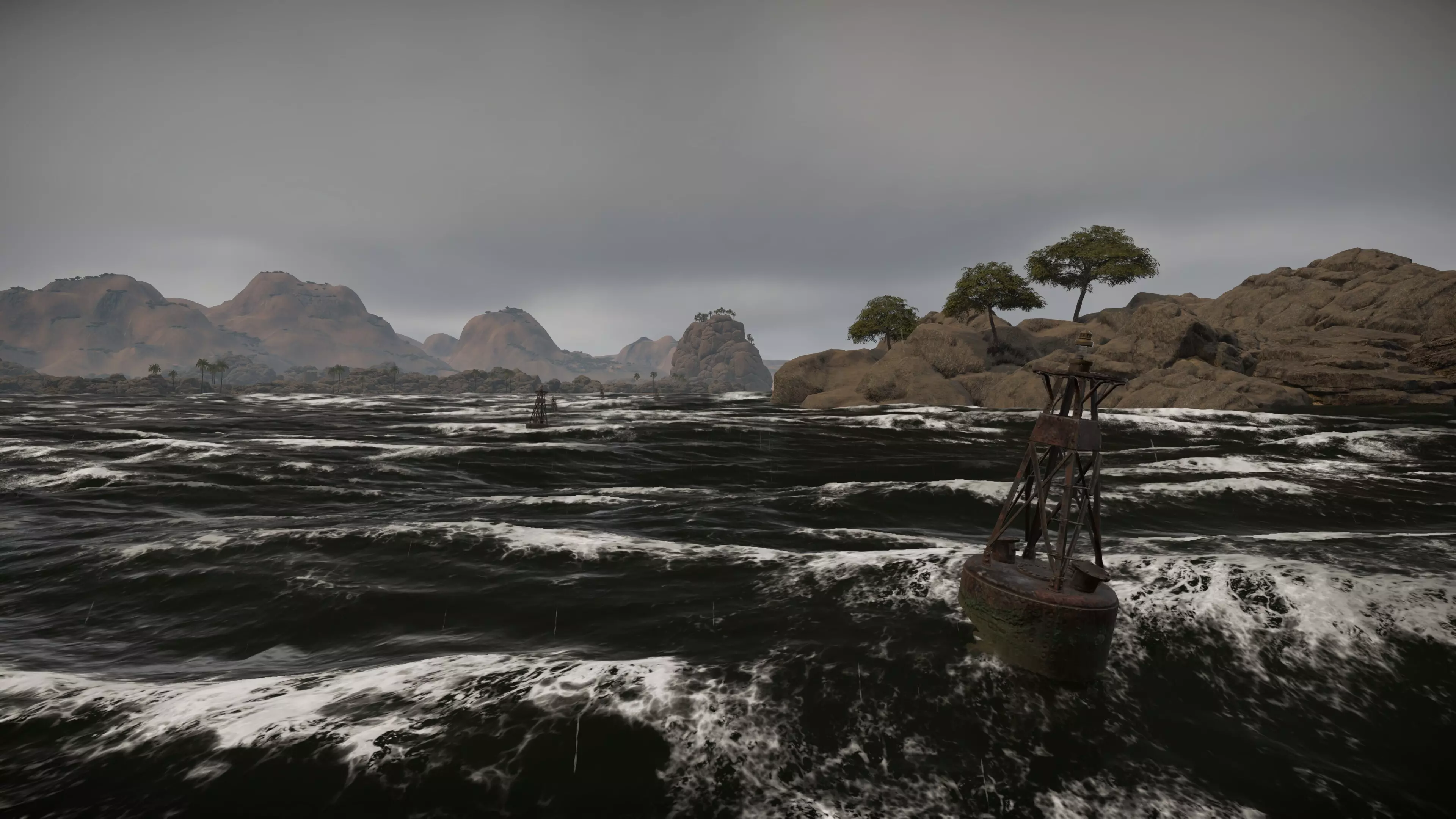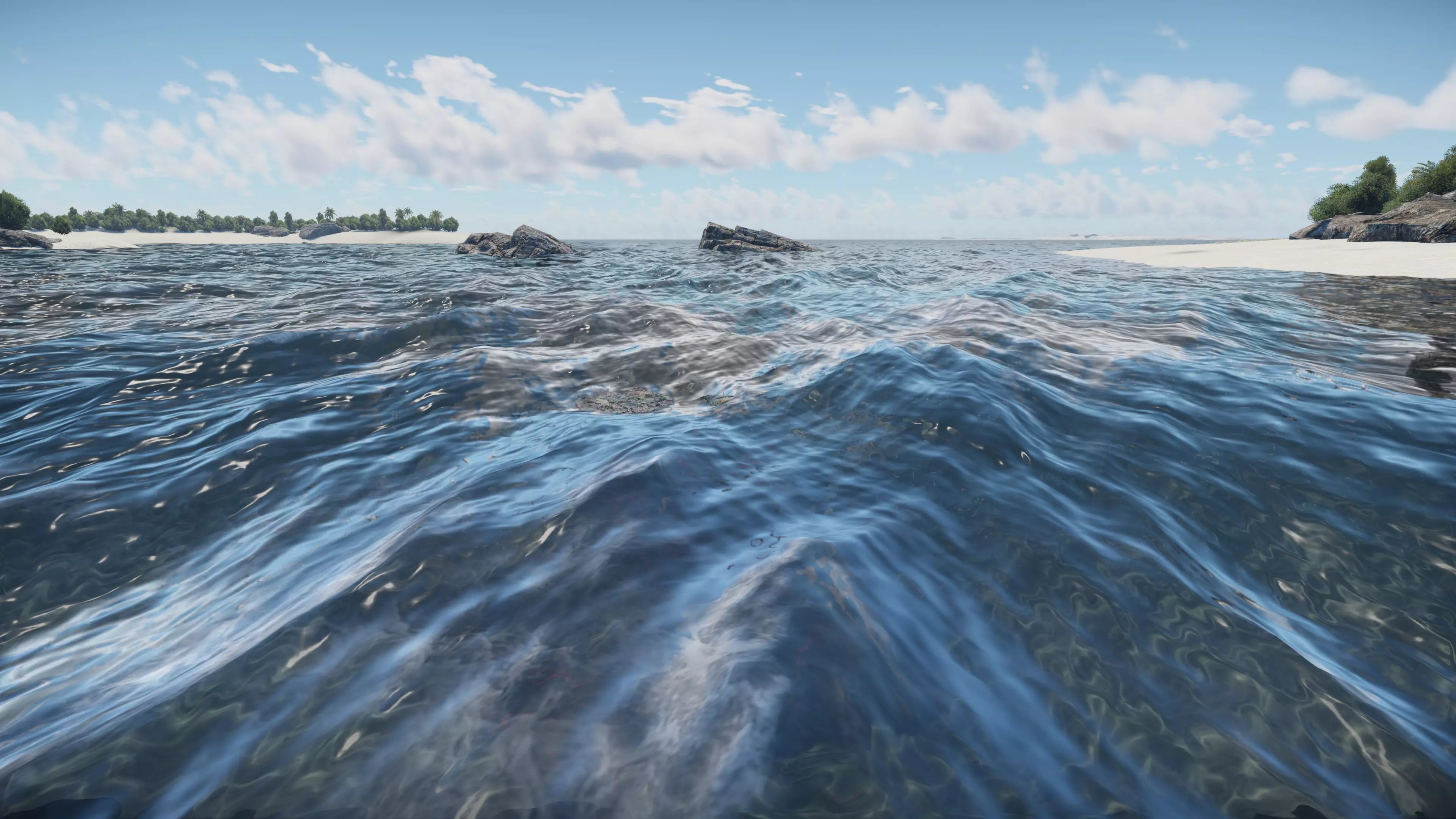 与此同时,透明度和混合算法也进行了重新设计,这在两种不同元素相遇时尤为明显——例如当泡沫粒子或水花与岩石、船体等不透明物体重叠时。我们还开发了透明度和渲染模式的新逻辑,这些改进消除了此前在大视角下扭曲反射的瑕疵。现在,即使在与摄像机夹角极小的情况下,水面也能保持清晰和物理精确的亮度。