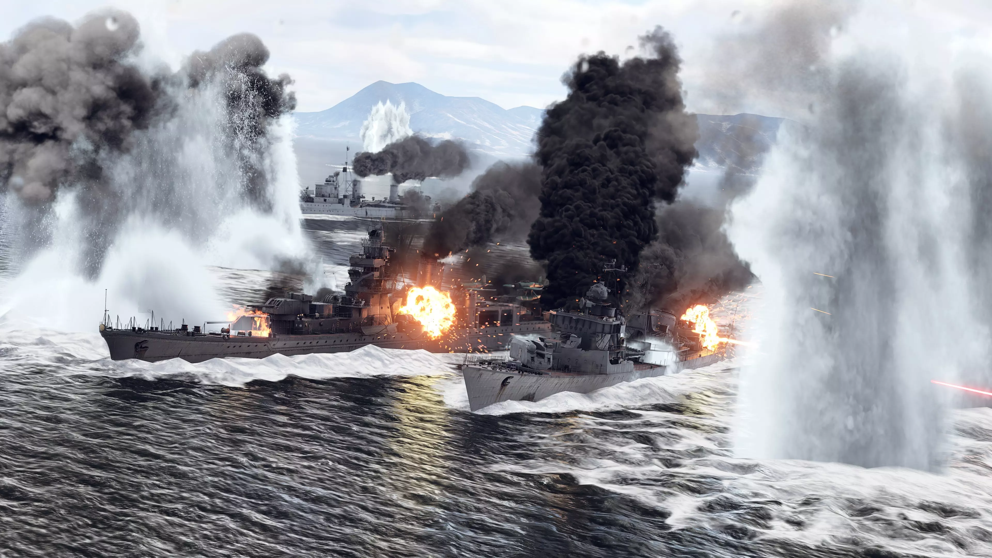 我们还对水环境粒子进行了重新定向,以在所有图像平面、所有图形设置以及图像各部分的各种光照强度下增加细节。水面不仅能正确反射光线,现在还具有“物理”结构,能够真实且动态地对变化和交互做出反应! 海战 在海战中,我们能最近距离地观察水面。现在,除了更新后的水面和水花效果外,我们还重新设计了战斗中可见的所有效果。炮弹、炸弹、子弹甚至弹壳与水面的每一次交互都得到了改进。炮弹和炸弹爆炸时会升起壮观的烟柱、泡沫与水花,机枪则会激起水柱,每一个落入水中的弹壳都能与水面产生真实的互动!鱼雷不仅外观逼真,在波浪中闪烁并留下泡沫尾迹;现在小地图上还会显示鱼雷标记,让你能更有效地追踪发射的鱼雷并判断其是否在正确航线上。