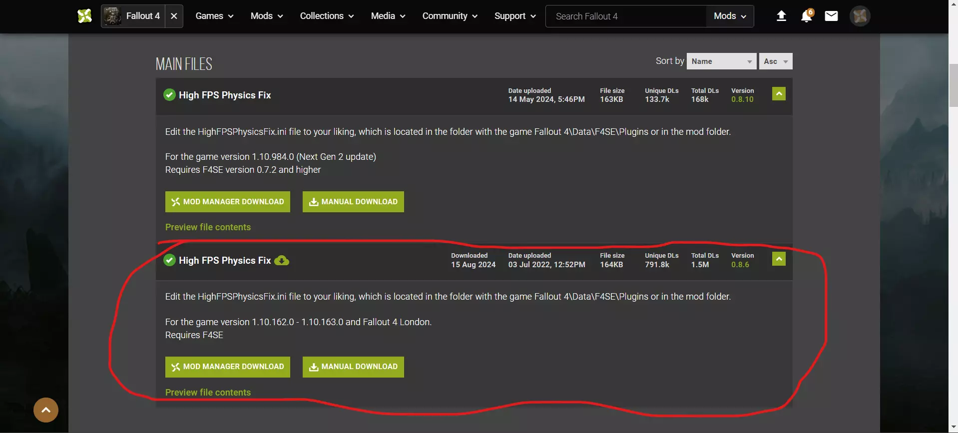 解锁帧率、修复FPS及更多内容 现在我们将为使用120Hz及更高刷新率显示器的玩家添加解锁帧率上限的方法。 步骤1:从Nexus Mods下载高FPS物理修复补丁(需要《辐射4:伦敦》和F4SE支持)