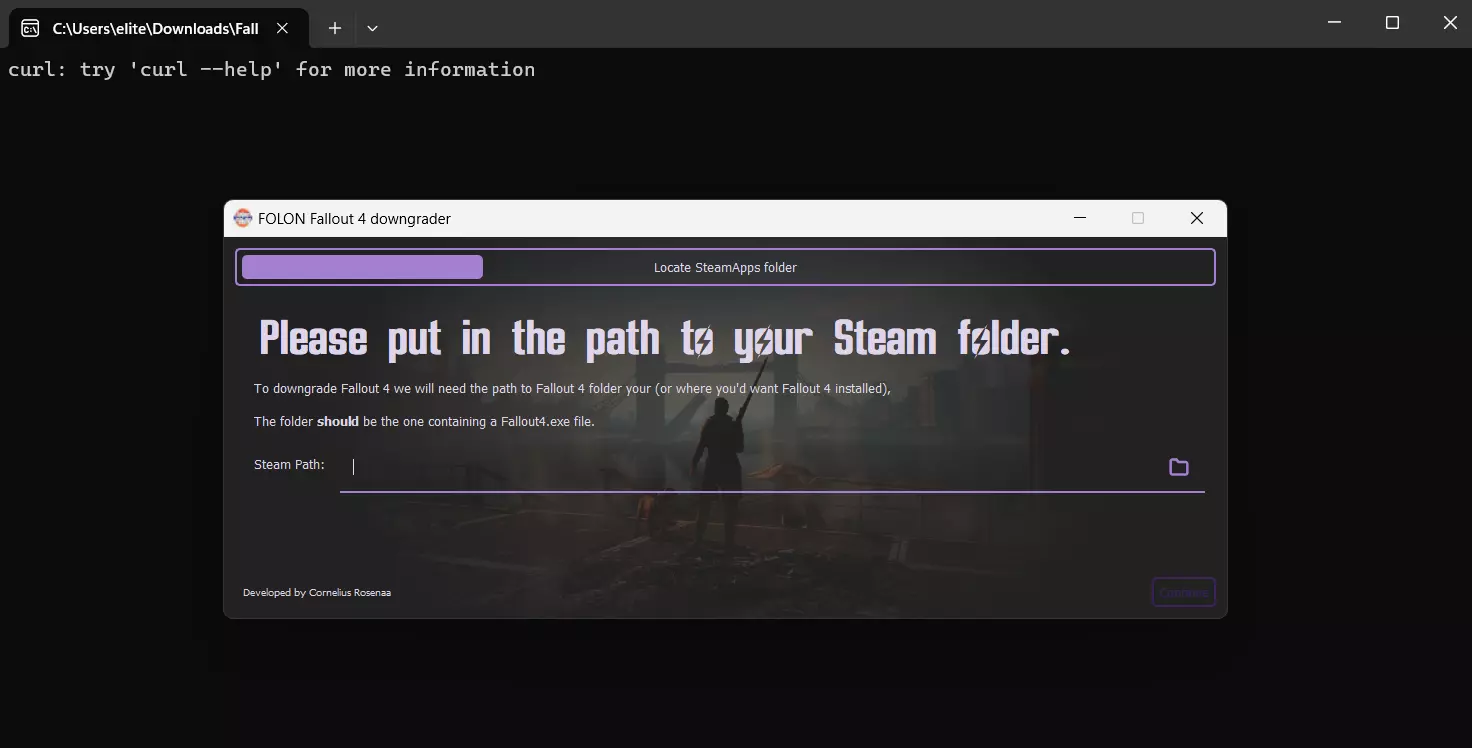 Nexus Mods 降级工具: 步骤4:找到你存放《辐射4》文件的Steam文件夹。 通常情况下,如果你正常游玩游戏且未修改过文件,路径应为: Program Filesx86>Steam>steamapps>common>Fallout 4 (如果这不是你的《辐射4》游戏文件路径,请选择相应的路径),然后点击继续,之后只需耐心等待降级完成。 注意:此操作会导致你无法再次游玩《辐射4》年度版,除非你卸载相关文件并重新安装游戏,才能恢复到之前的版本。