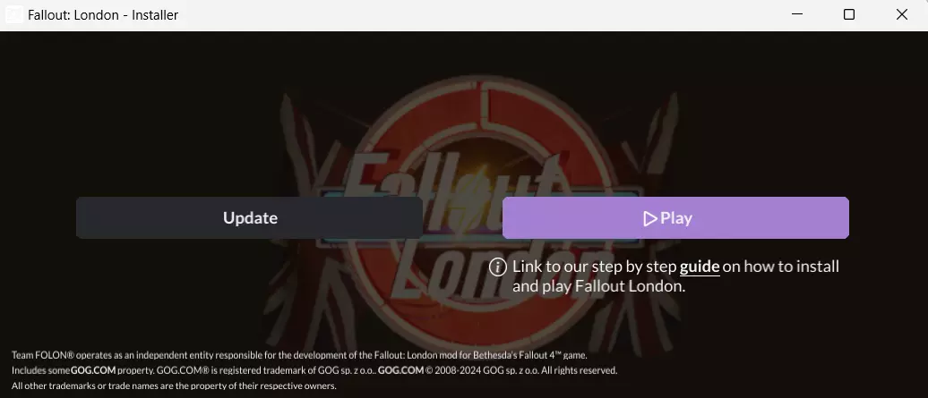 有视频证明其可正常运行。 是的,正如之前所述,现在两个启动器都能运行该模组,直到你卸载它,届时它应该会恢复到之前的状态。但如上文步骤所述,仍建议在《辐射4》脚本扩展器(Fallout 4 Script Extender)下运行游戏,以避免游戏出现功能异常。 安装一次后,你可以在GOG游戏平台上卸载它,但要注意,这意味着你将无法从GOG游戏平台启动游戏或在有新更新时进行更新,而是需要从Steam启动,因为你已经将游戏文件整合到了《辐射4》文件夹中,这样可以节省空间。提醒:这样做当然会使游戏无法通过GOG Games运行,但它仍然可以通过Steam运行,因为你已经下载了包含《辐射4》文件的游戏文件!你之前必须在GOG上安装它的原因是为了获取安装程序。享受《辐射伦敦》吧!