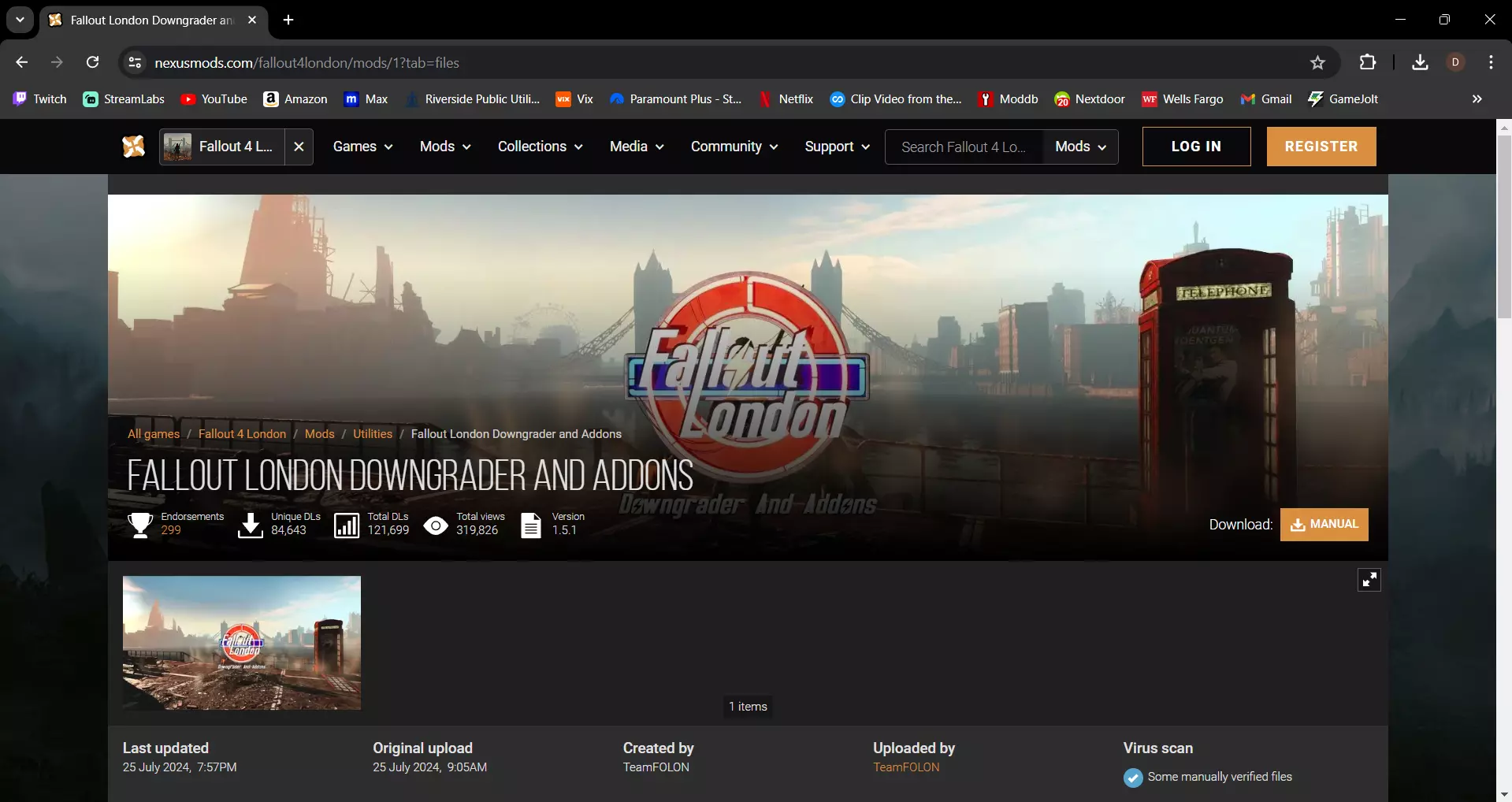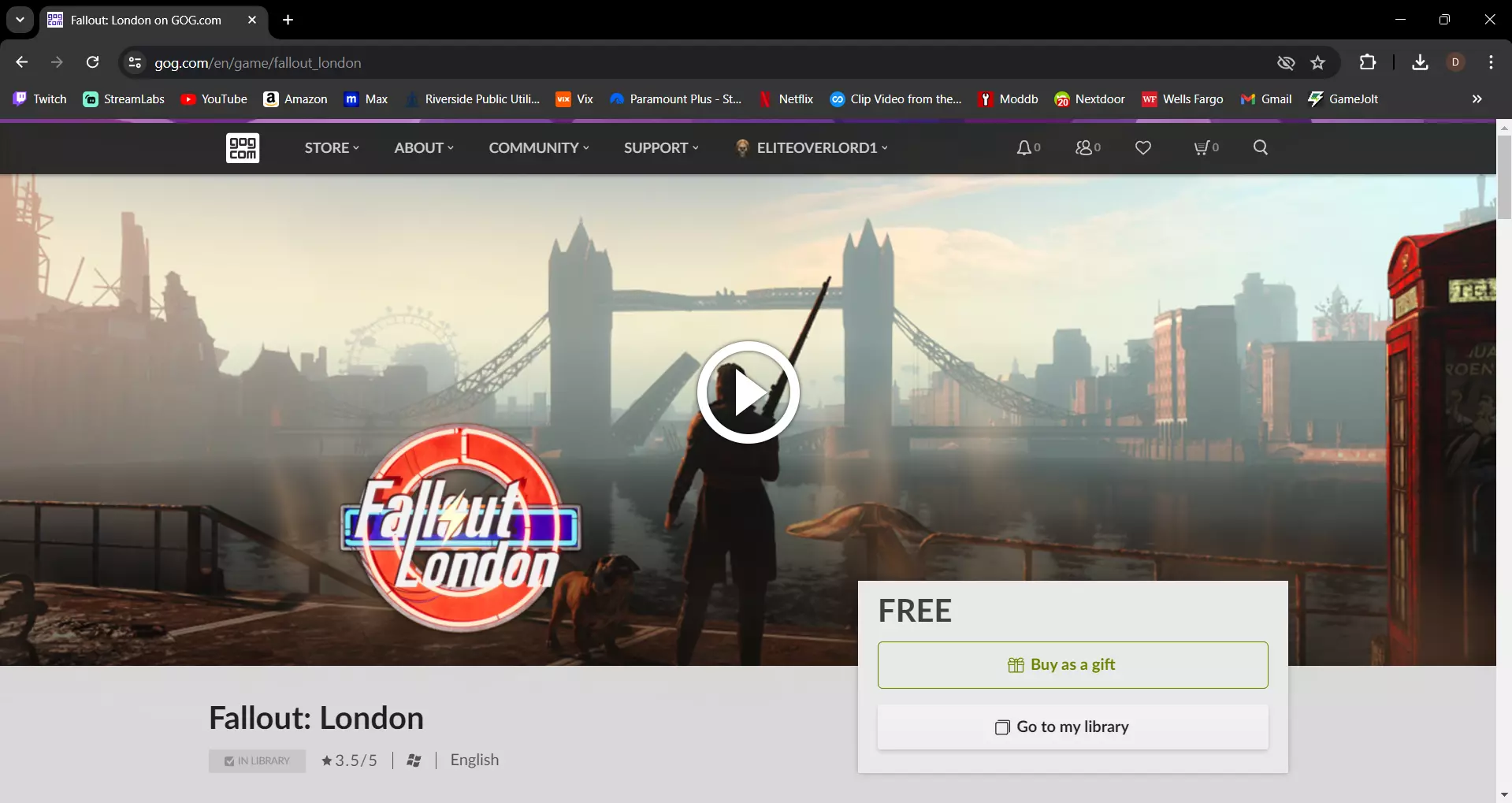 第二步 免费获取《辐射4》伦敦MOD 接下来你需要从网站获取该MOD并添加到你的收藏中,后续步骤取决于你是通过Steam还是GOG游戏平台游玩《辐射4》。如果你通过Steam游玩,那么下一步需要下载降级补丁。(我这里显示“作为礼物购买”是因为我已经获取过了)