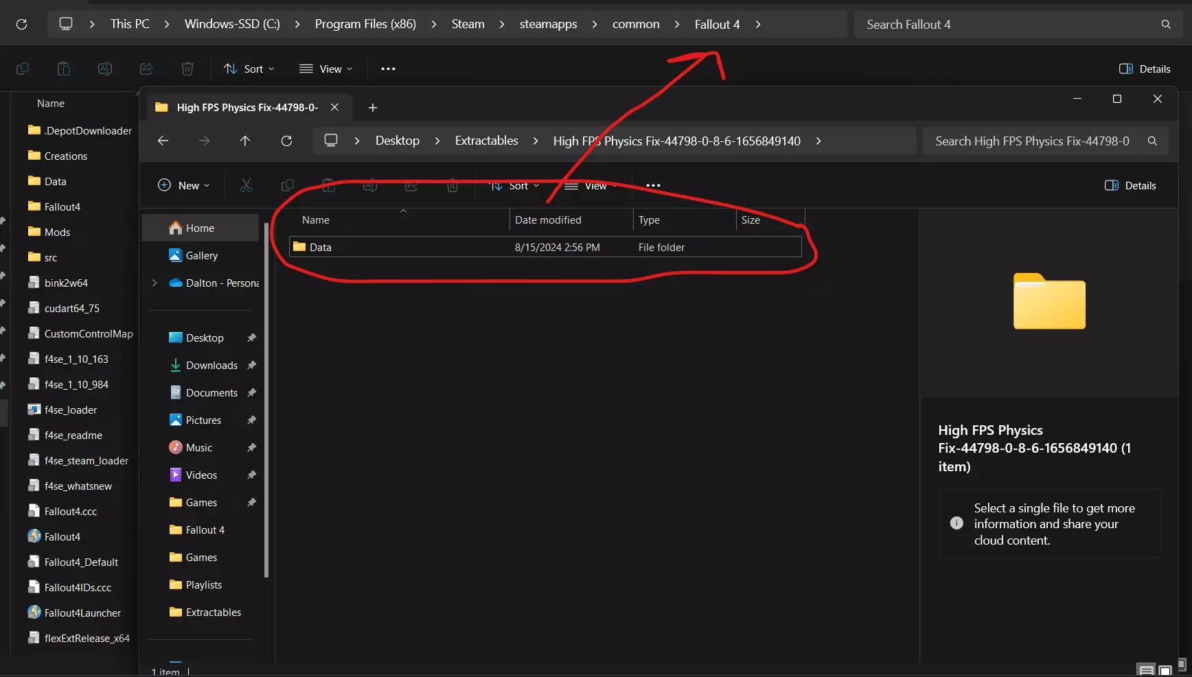 第二步:从下载的文件夹中提取内容并添加进去 现在你需要解压这个压缩文件夹,之后会得到一个名为【高帧率物理修复】的文件夹。双击该文件夹,你会看到data文件夹。现在将这个data文件夹添加到你的《辐射4》文件夹中。如果未修改过安装路径,该文件夹通常位于:Program Filesx86>Steam>steamapps>common>Fallout 4
