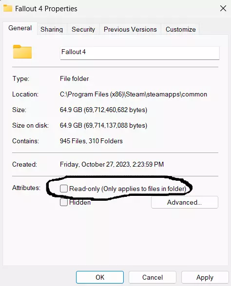 接下来你会看到一个方框,旁边有“只读”字样(首次查看时它应该是勾选状态)。取消勾选该方框,然后点击“应用”。完成这些步骤后,你应该就能下载更新了!这一步的作用是允许该文件夹内的文件被Steam和GOG游戏等兼容程序更新或修改。