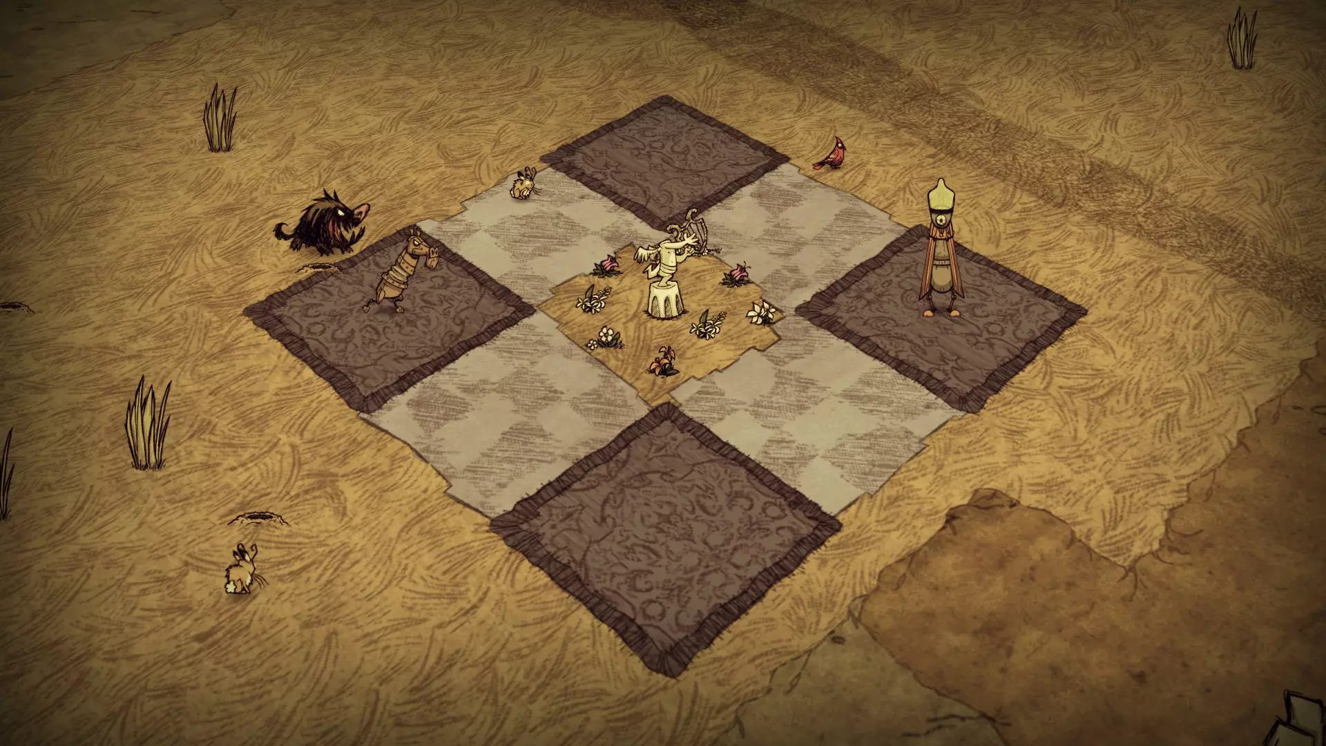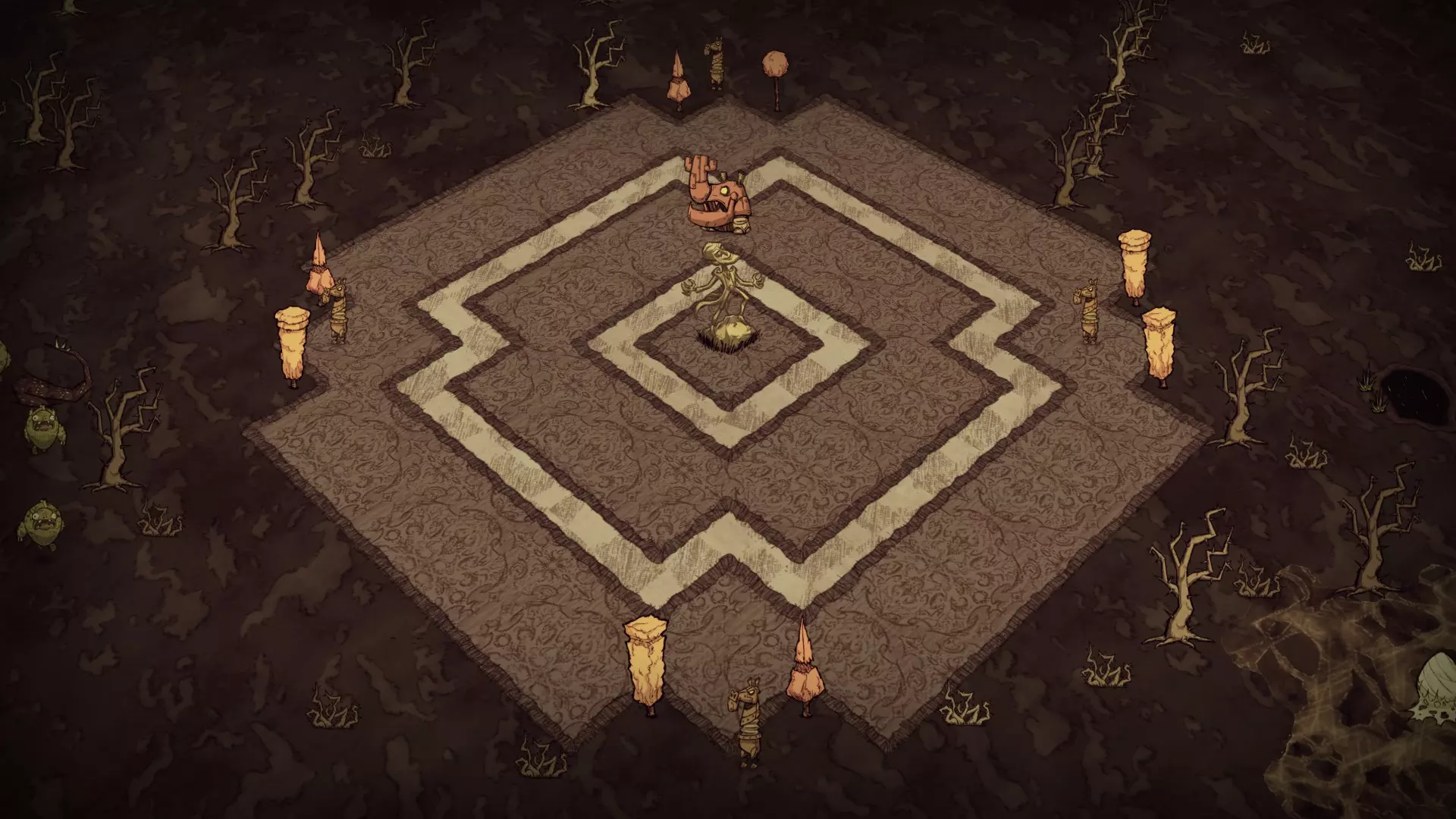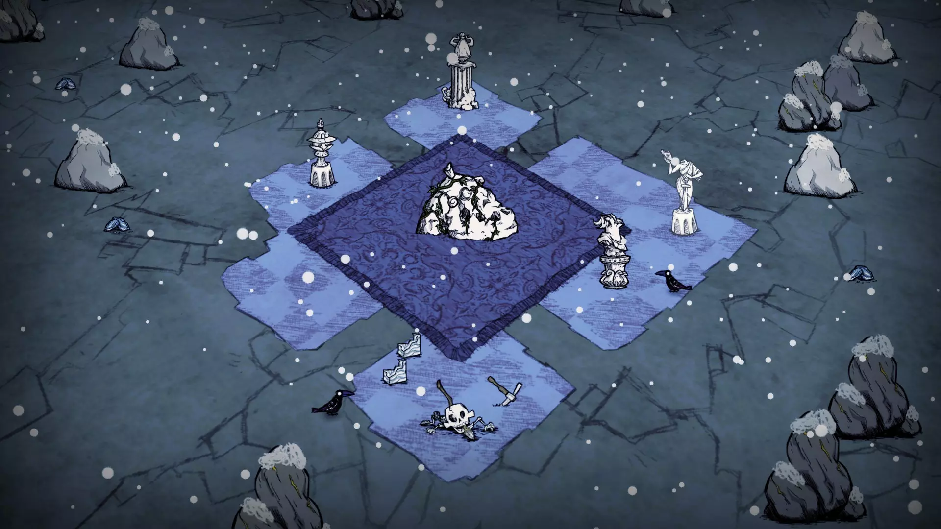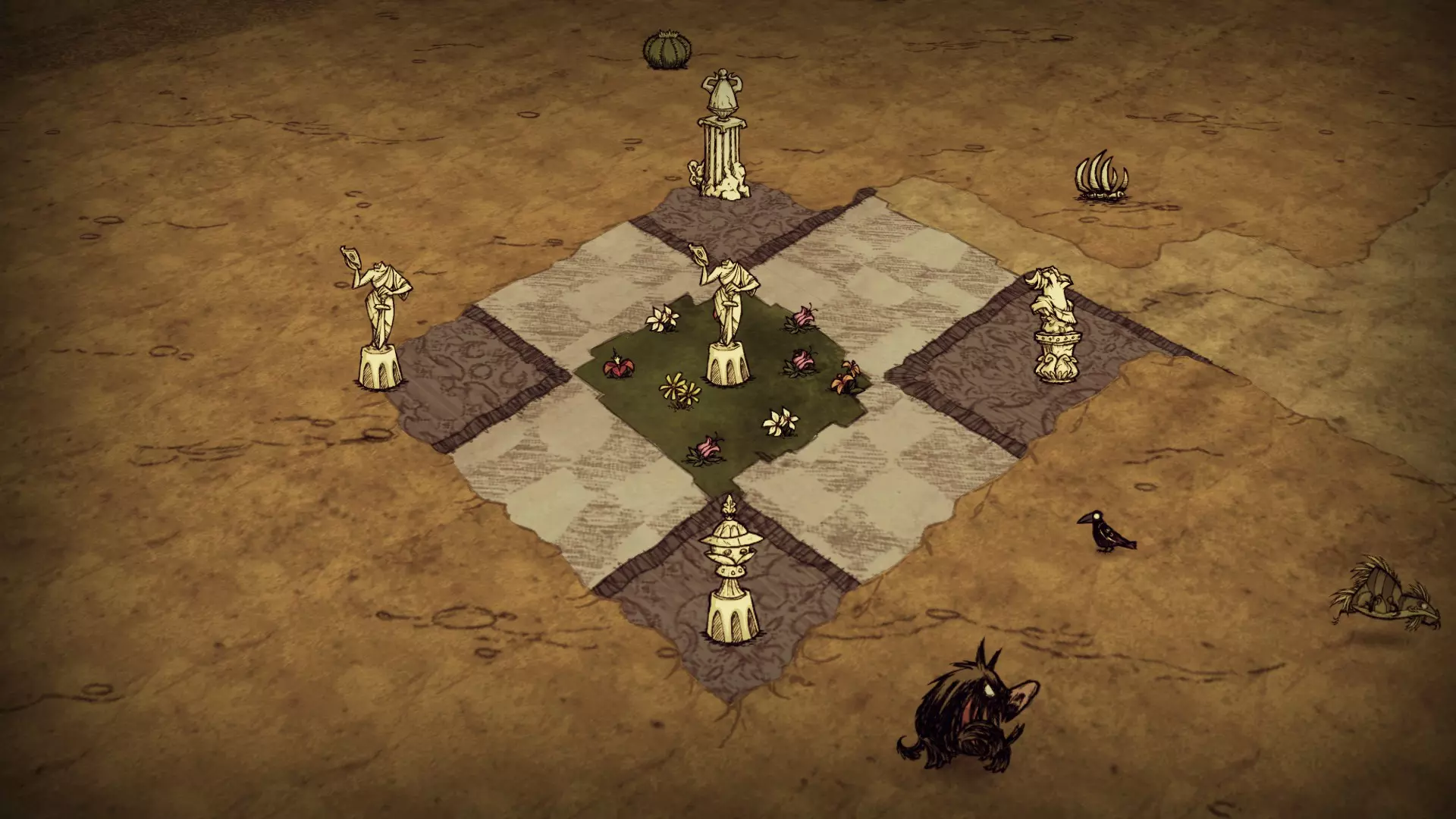 此变体仅限于特定生物群系(自潮起更新后已不准确): 蜜蜂女王 曼德拉草森林 猪王 岩石地 青蛙池塘 另有四种其他变体,均为可选,包含不同的组件排列。部分变体包含每个组件的多个副本。与固定变体不同,这些组件可在任何生物群系中找到。以下是可选大理石雕塑组件的示例。