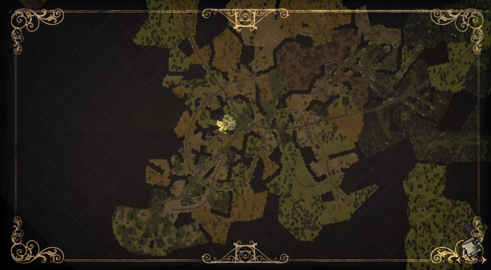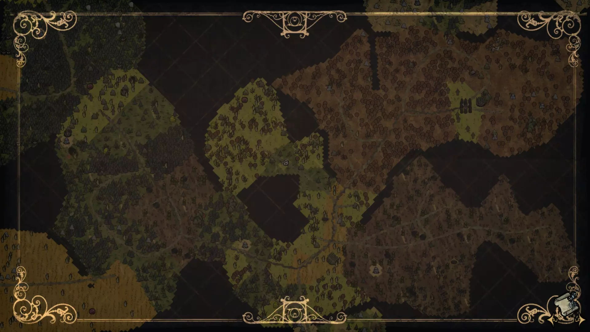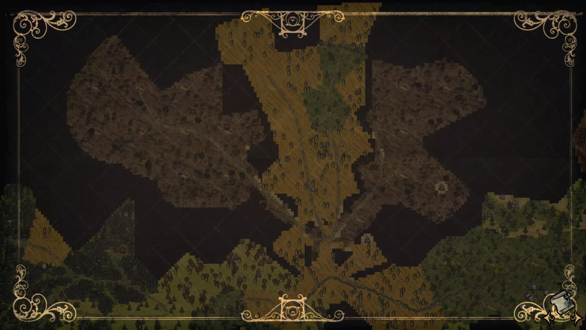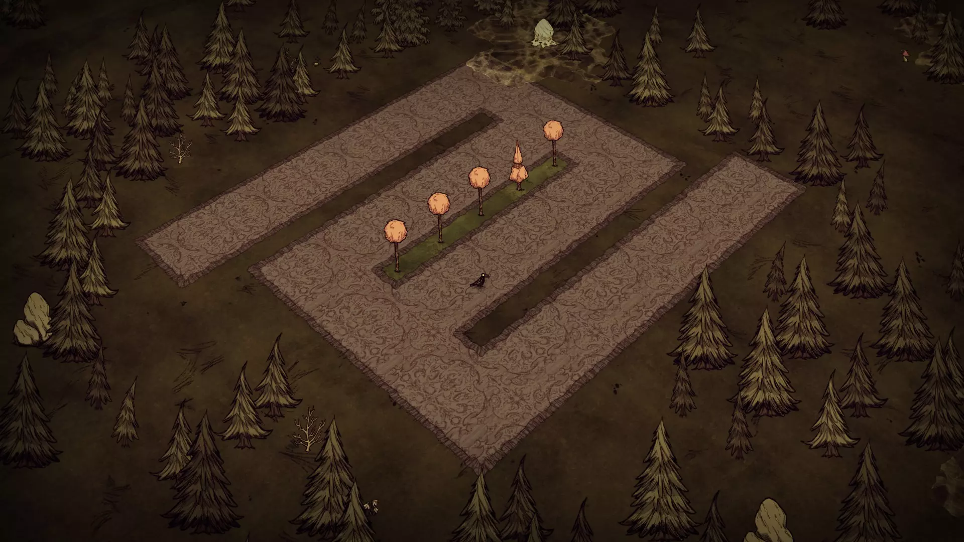 常青森林是一个包含猪房、蜘蛛巢穴和坟墓的区域。这个区域占据了该生物群系的大部分,主要生长着常青树。猪房和蜘蛛巢穴数量众多,且通常一起出现。这里经常能找到树苗/多枝树,但不会生成草。含燧石和含金的 Boulder(岩石)非常稀少。红蘑菇和绿蘑菇是这个生物群系区域独有的,且相对常见。这里有花朵,但与曼德拉草田相比数量较少。驼鹿池塘地形会在这里生成,不过也能找到单独的池塘。 曼德拉草田: