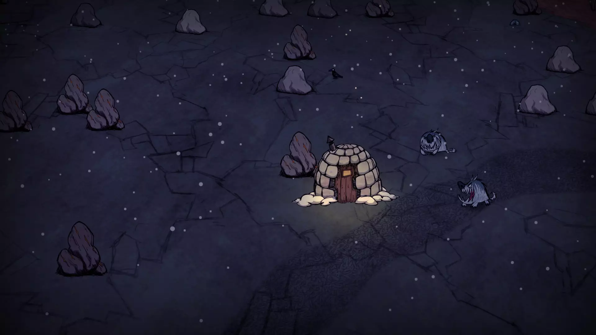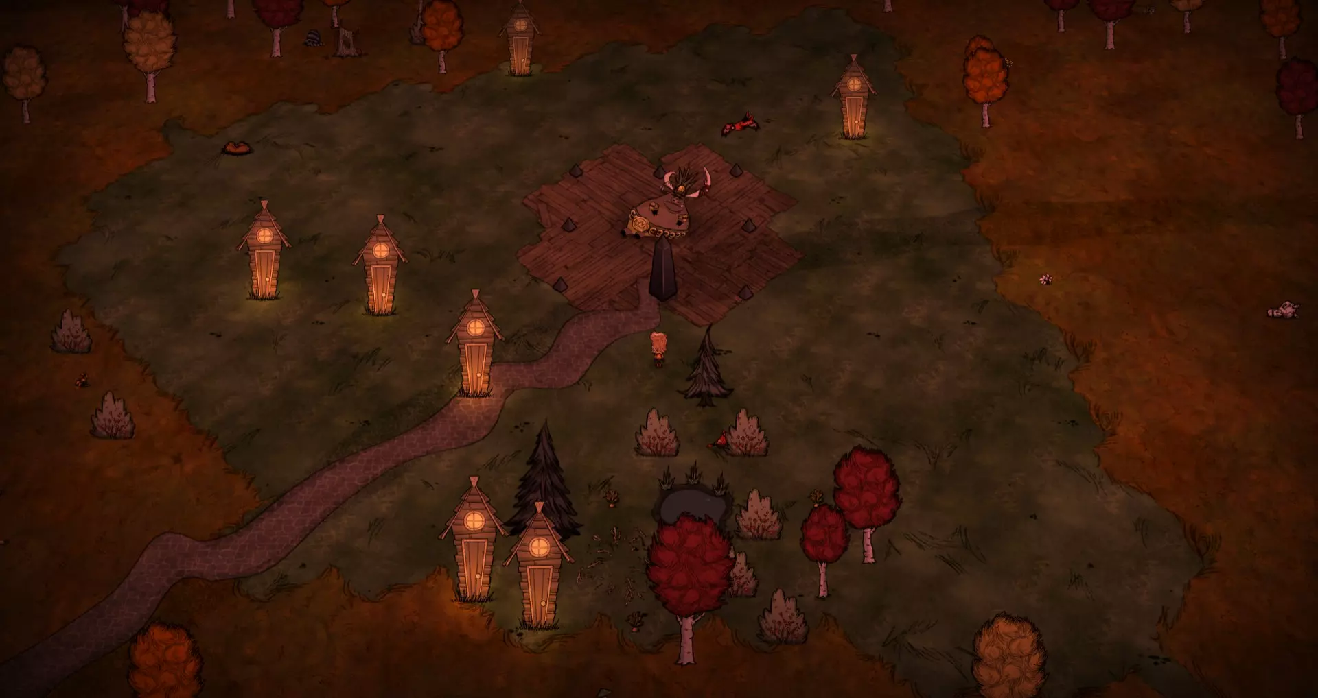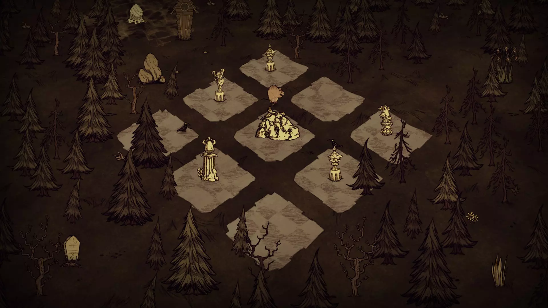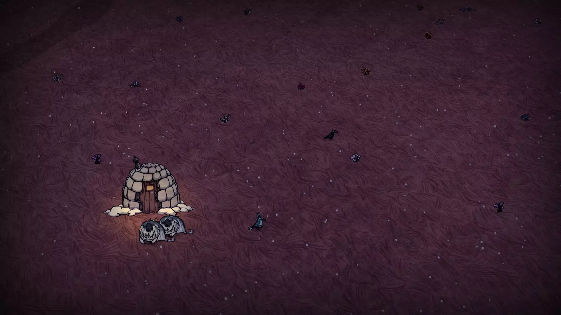 启动转化过程后,月石周围所有的可疑月岩都会复活。完全完整的月岩会复活猎犬/猪人狼人。部分破损的月岩复活的生物会在复活后立即死亡,并掉落它们的常规战利品。 转化过程需要不到1分钟(略少于两个白天时段)完成。当总数少于6只时,会额外生成猎犬和猪人狼人,它们会聚集到月石处试图阻止转化。当转化过程结束(无论成功或失败),所有仍存活的猎犬和猪人狼人都会转化为可疑月岩。 海象营地仅在冬季活跃。雪屋会在冬季开始时生成,生成条件是玩家处于营地的渲染距离之外。每个麦克 tus 成员在死亡后经过 2.5 天,会在第二天开始时重生。 资源: 草 树苗/多枝树 浆果丛 含硝石的岩石 含金的岩石 燧石 红、绿、蓝蘑菇 花 常青树 多瘤常青树 猪房 蜘蛛巢穴 鼹鼠洞穴 萤火虫 坟墓 完全正常的树 池塘 可选建筑: 蜘蛛陷阱