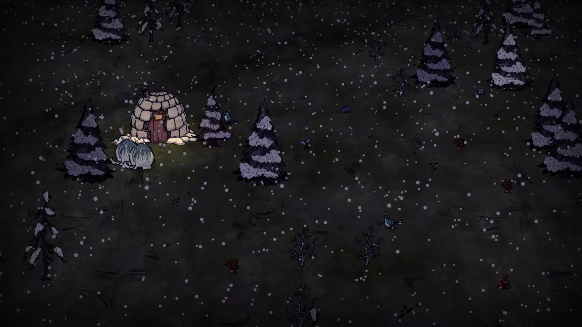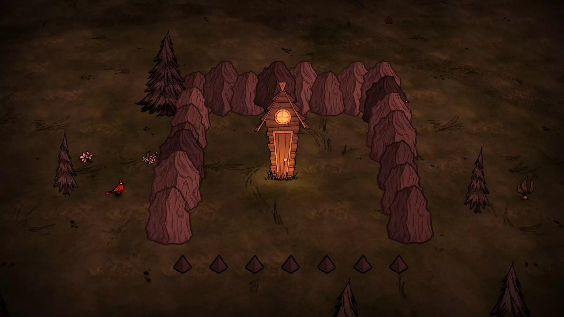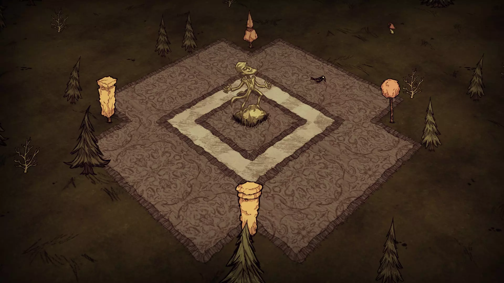 启动转化过程后,月石周围所有的可疑月岩都会复活。完全完整的月岩会复活猎犬/猪人狼人。部分破损的月岩复活的生物会在复活后立即死亡,并掉落它们的常规战利品。 转化过程需要不到1分钟(略少于两个白天时段)完成。当总数少于6只时,会额外生成猎犬和猪人狼人,它们会聚集到月石处试图阻止转化。当转化过程结束(无论成功或失败),所有仍存活的猎犬和猪人狼人都会转化为可疑月岩。 海象营地仅在冬季活跃。雪屋会在冬季开始时生成,生成条件是玩家处于营地的渲染距离之外。每个麦克 tus 成员在死亡后经过 2.5 天,会在第二天开始时重生。 资源: 草 树苗/多枝树 浆果丛 含硝石的岩石 含金的岩石 燧石 红、绿、蓝蘑菇 花 常青树 多瘤常青树 猪房 蜘蛛巢穴 鼹鼠洞穴 萤火虫 坟墓 完全正常的树 池塘 可选建筑: 蜘蛛陷阱