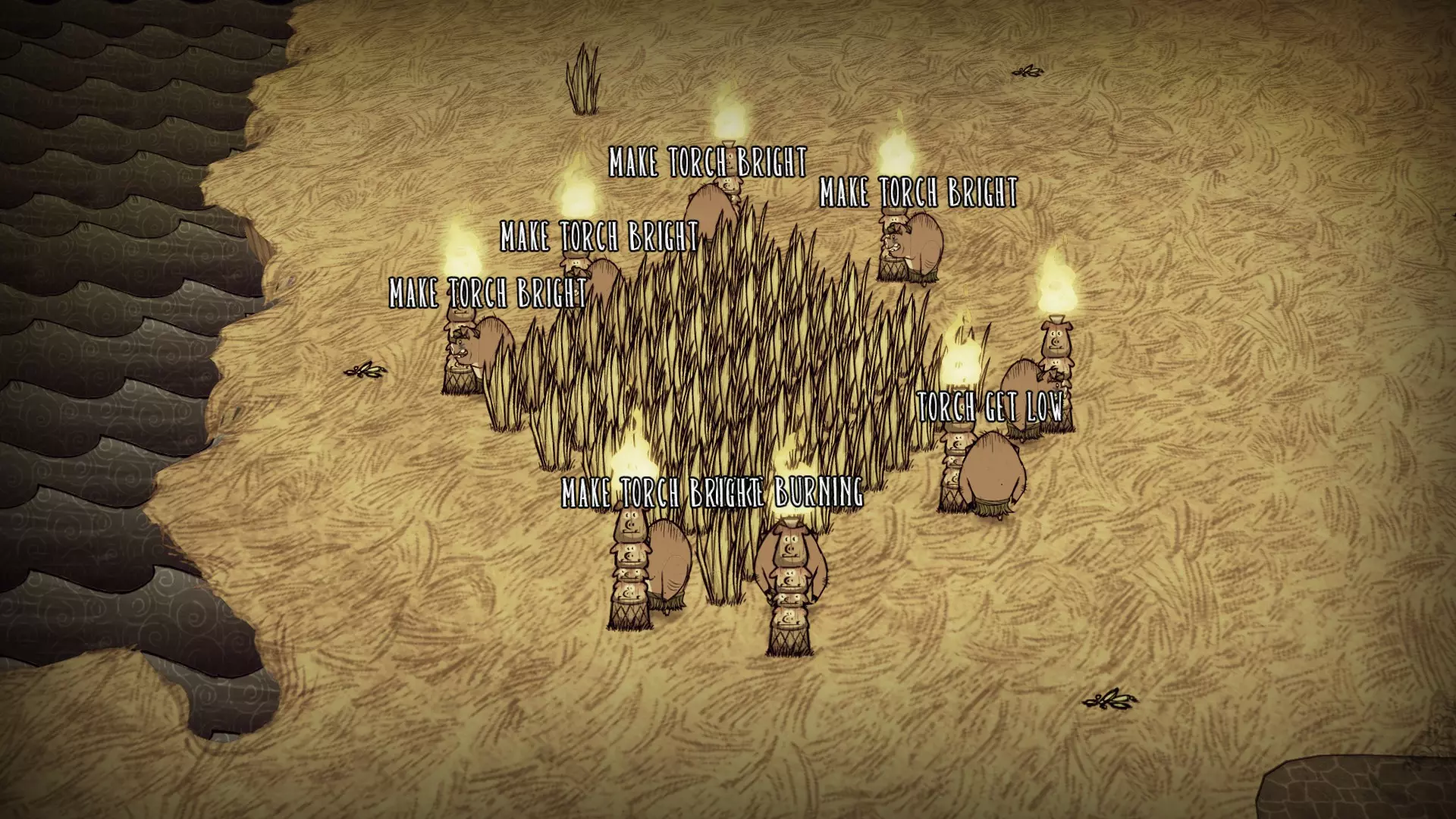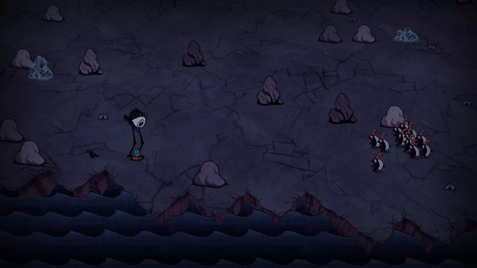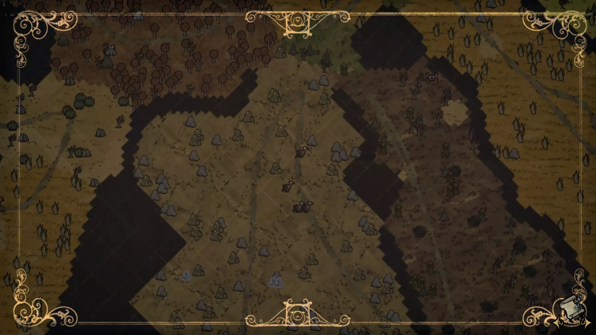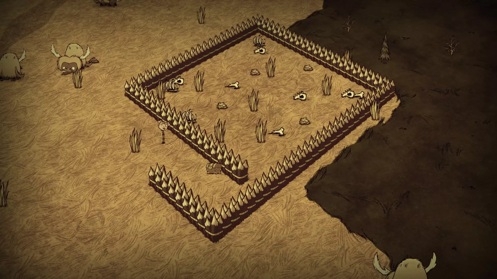 启动转化过程后,月石周围所有的可疑月岩都会复活。完全完整的月岩会复活猎犬/猪人狼人。部分破损的月岩复活的生物会在复活后立即死亡,并掉落它们的常规战利品。 转化过程需要不到1分钟(略少于两个白天时段)完成。当总数少于6只时,会额外生成猎犬和猪人狼人,它们会聚集到月石处试图阻止转化。当转化过程结束(无论成功或失败),所有仍存活的猎犬和猪人狼人都会转化为可疑月岩。 海象营地仅在冬季活跃。雪屋会在冬季开始时生成,生成条件是玩家处于营地的渲染距离之外。每个麦克 tus 成员在死亡后经过 2.5 天,会在第二天开始时重生。 资源: 草 树苗/多枝树 浆果丛 含硝石的岩石 含金的岩石 燧石 红、绿、蓝蘑菇 花 常青树 多瘤常青树 猪房 蜘蛛巢穴 鼹鼠洞穴 萤火虫 坟墓 完全正常的树 池塘 可选建筑: 蜘蛛陷阱