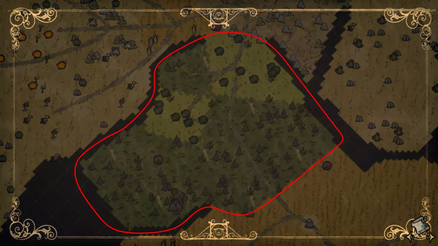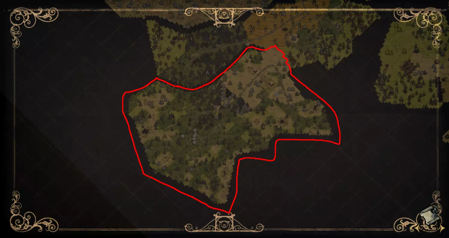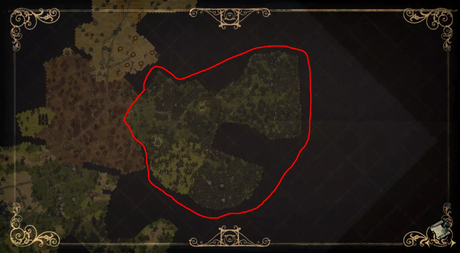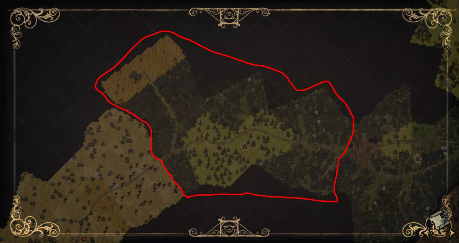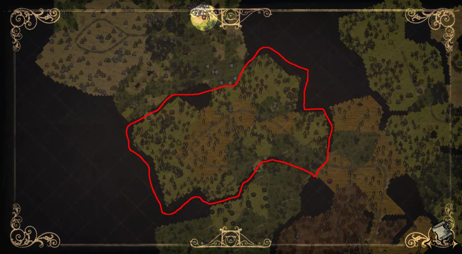 森林区域占据了整个生态群落的大部分,主要包含桦树坚果树以及树苗/多枝树。花朵很常见,但胡萝卜数量稀少。这里可以找到草丛,但非常稀疏。三种蘑菇都能在这里找到,但密度比glommer雕像区域低。空心树桩(会生成浣熊猫)和猪屋并不少见。无眼鹿和/或战利品藏匿点有机会出现在这个区域。萤火虫非常常见。