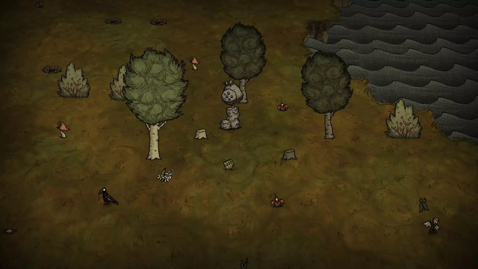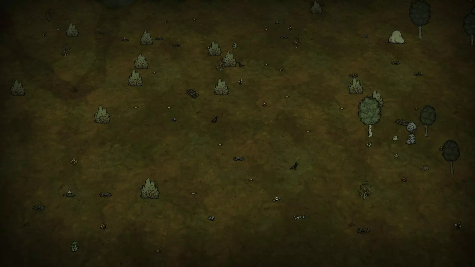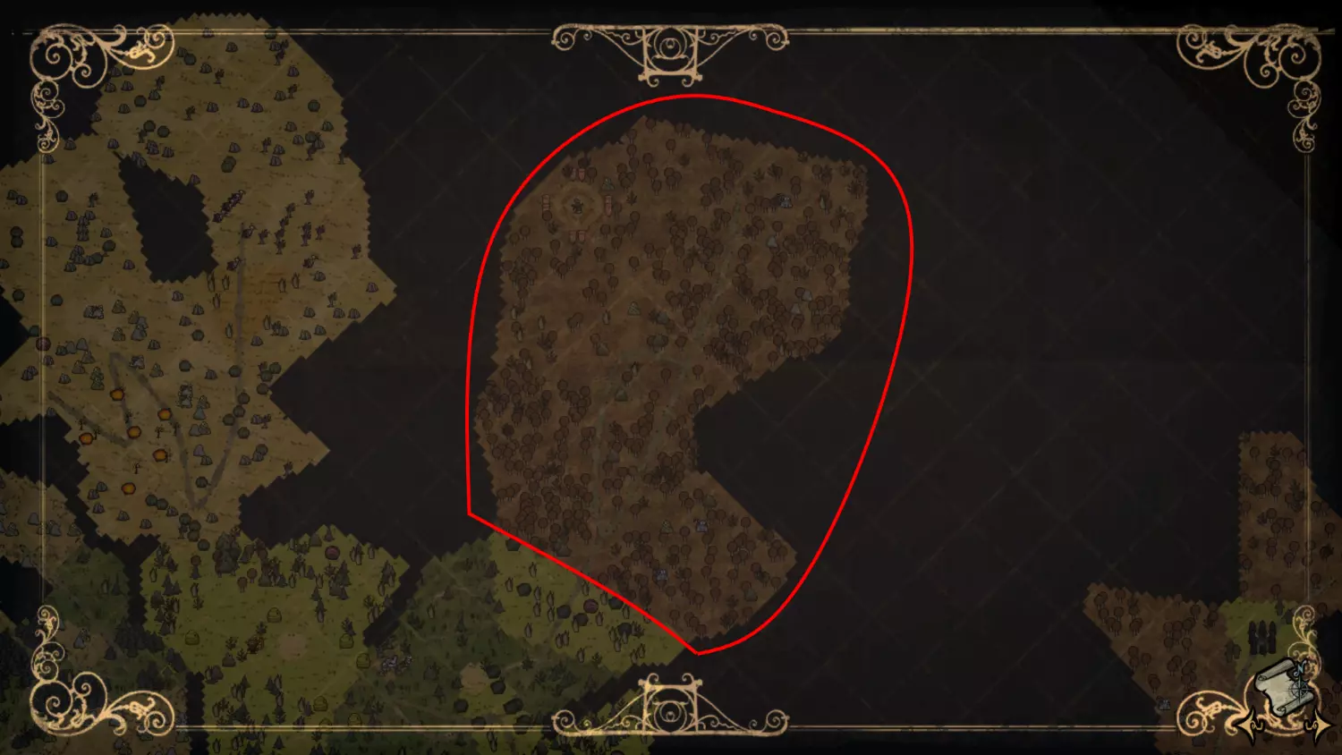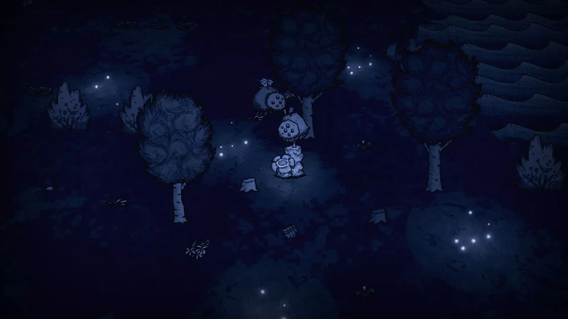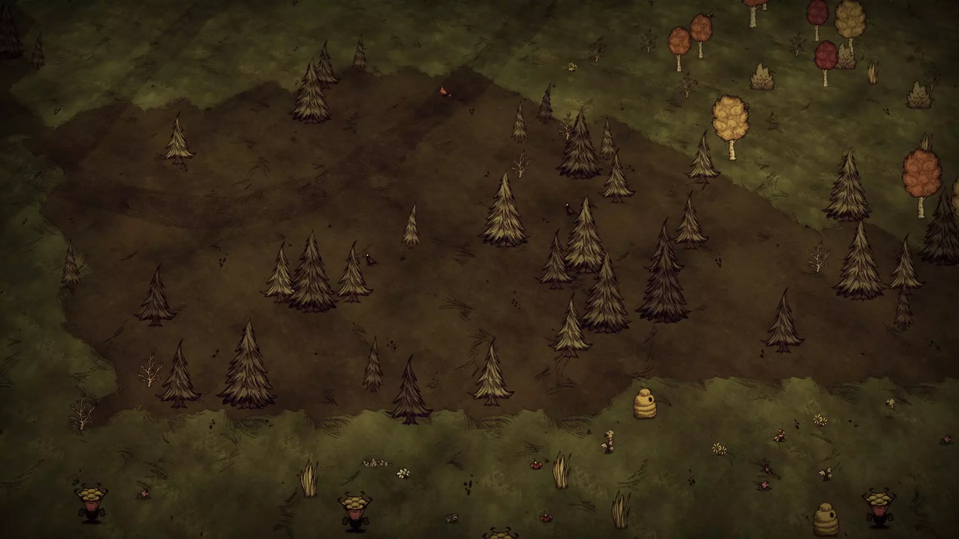 森林区域占据了整个生态群落的大部分,主要包含桦树坚果树以及树苗/多枝树。花朵很常见,但胡萝卜数量稀少。这里可以找到草丛,但非常稀疏。三种蘑菇都能在这里找到,但密度比glommer雕像区域低。空心树桩(会生成浣熊猫)和猪屋并不少见。无眼鹿和/或战利品藏匿点有机会出现在这个区域。萤火虫非常常见。