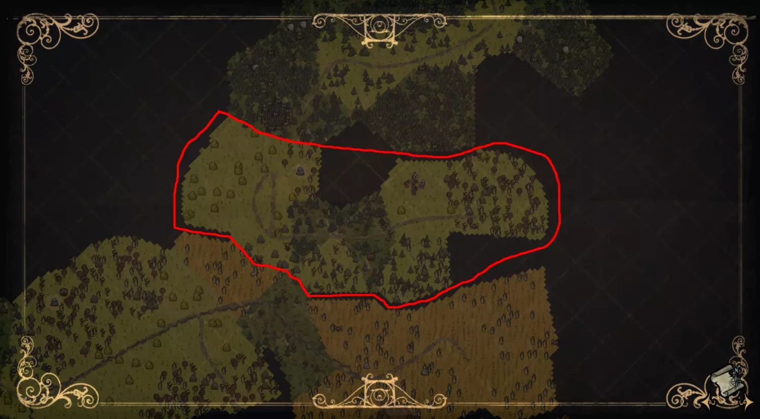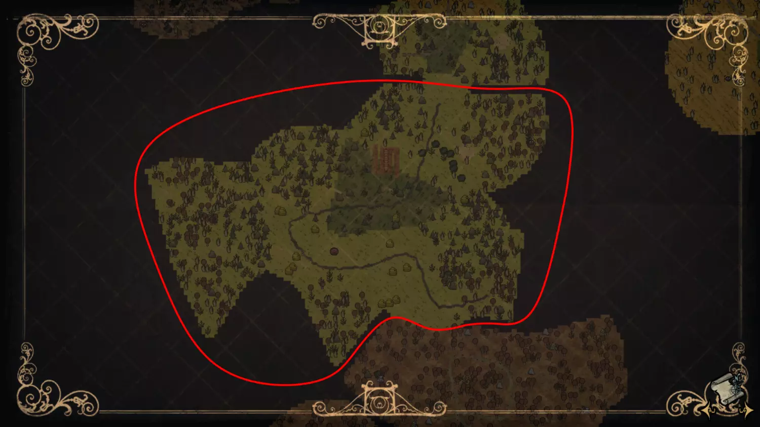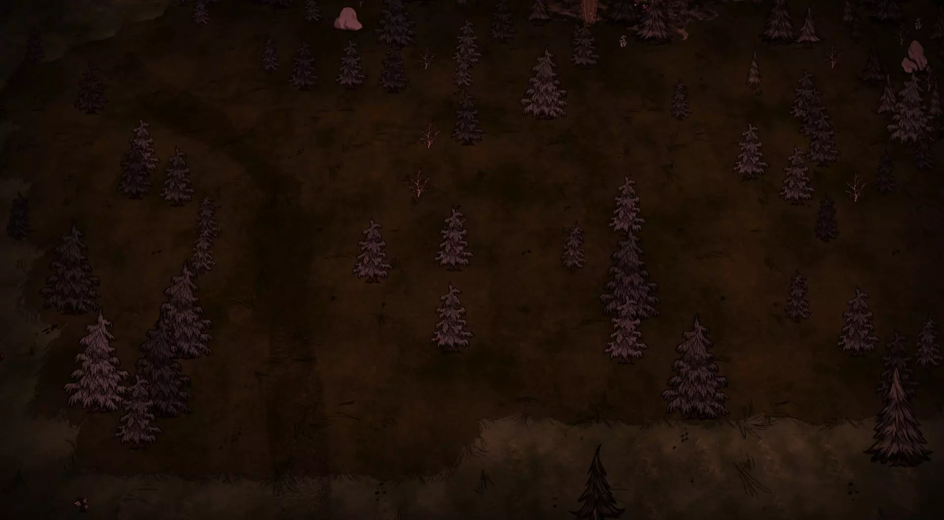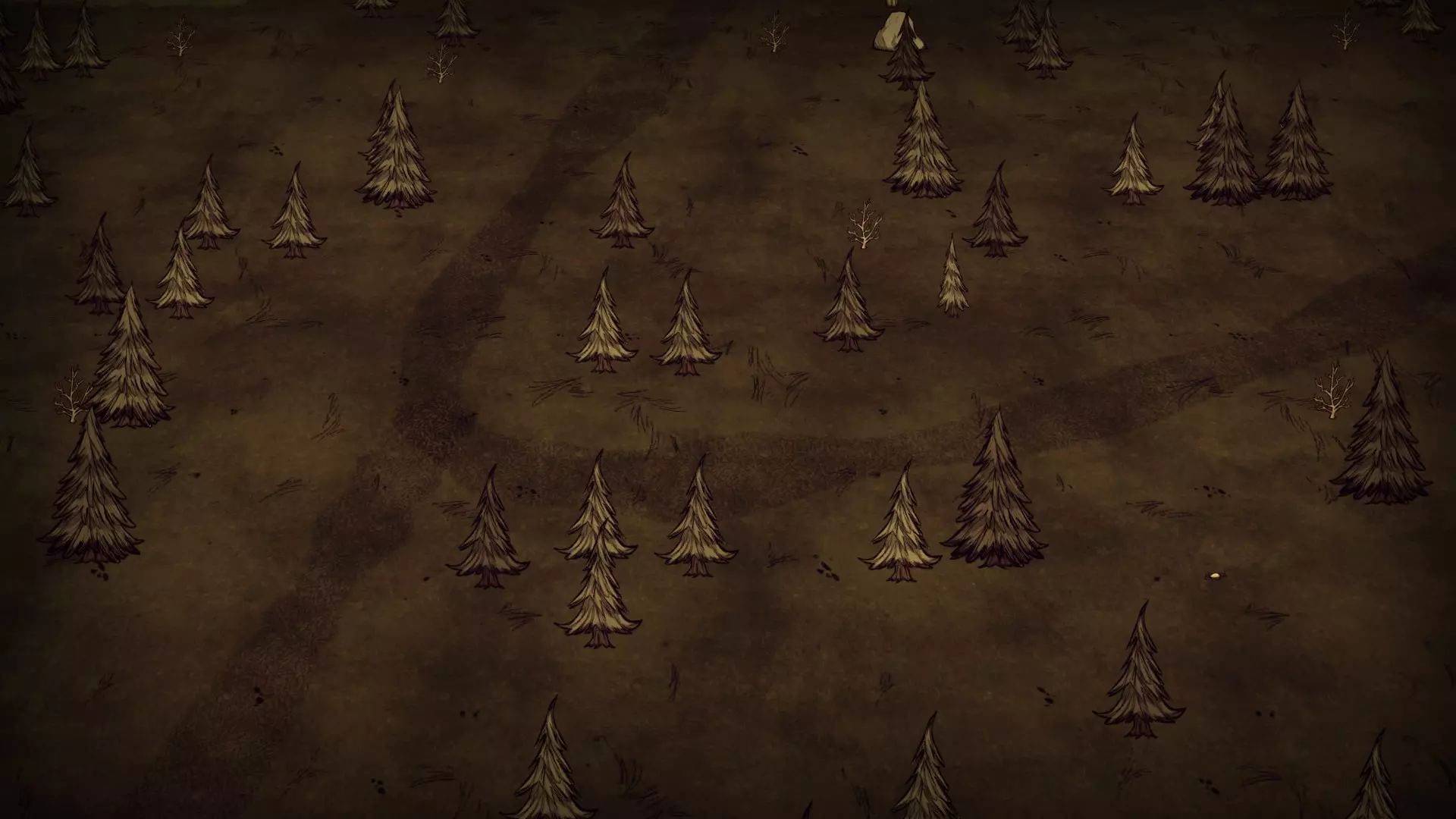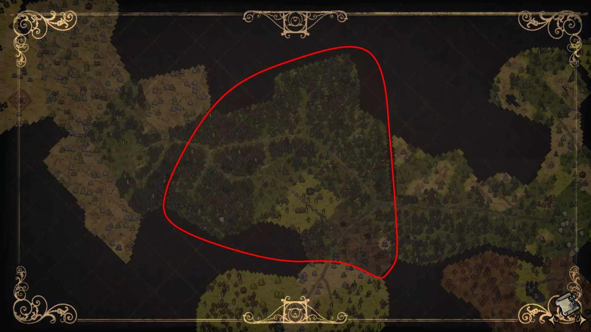 森林区域占据了整个生态群落的大部分,主要包含桦树坚果树以及树苗/多枝树。花朵很常见,但胡萝卜数量稀少。这里可以找到草丛,但非常稀疏。三种蘑菇都能在这里找到,但密度比glommer雕像区域低。空心树桩(会生成浣熊猫)和猪屋并不少见。无眼鹿和/或战利品藏匿点有机会出现在这个区域。萤火虫非常常见。
