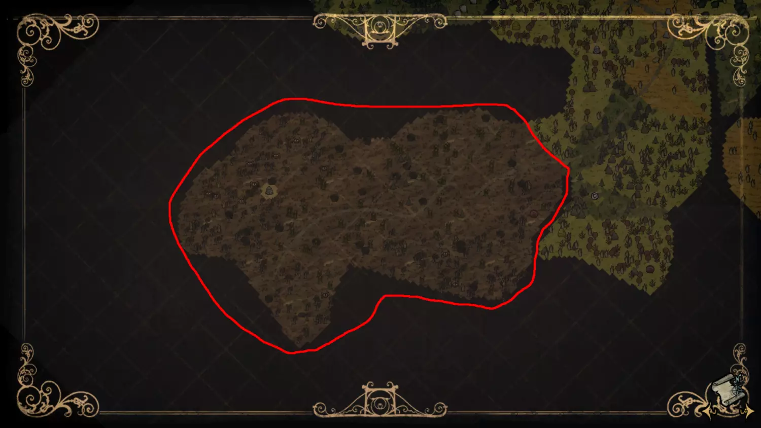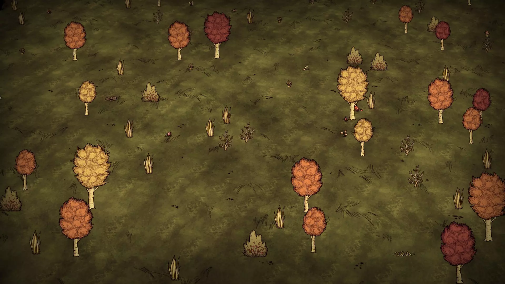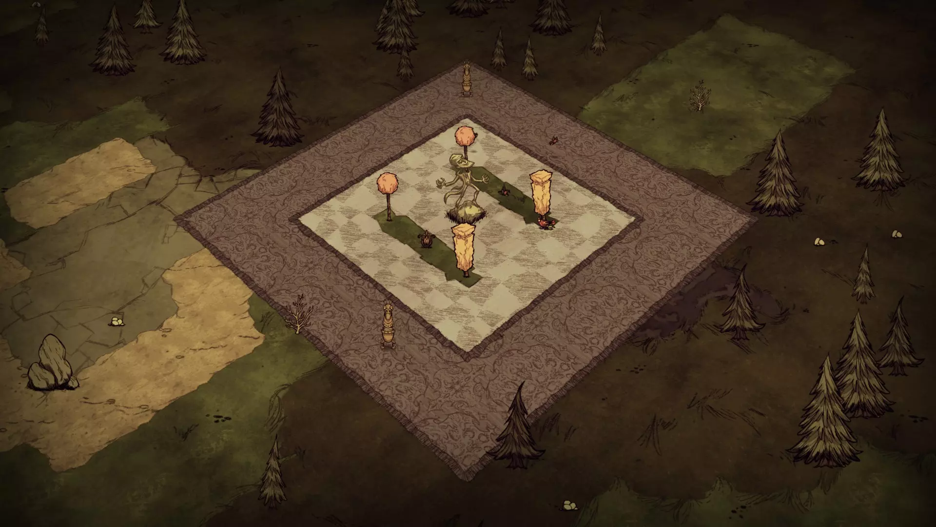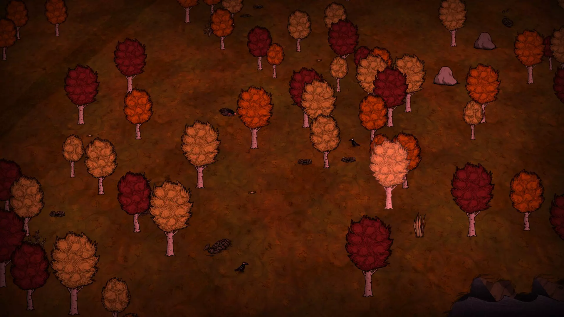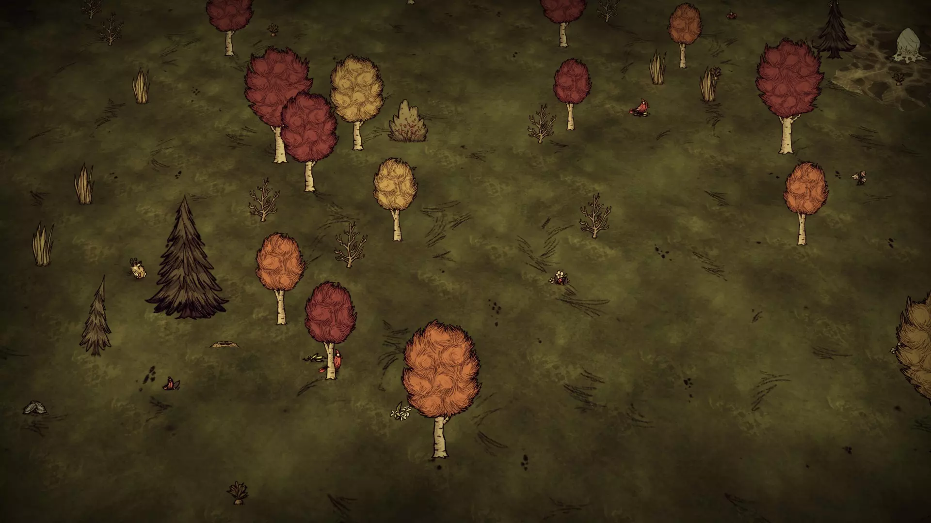 森林区域占据了整个生态群落的大部分,主要包含桦树坚果树以及树苗/多枝树。花朵很常见,但胡萝卜数量稀少。这里可以找到草丛,但非常稀疏。三种蘑菇都能在这里找到,但密度比glommer雕像区域低。空心树桩(会生成浣熊猫)和猪屋并不少见。无眼鹿和/或战利品藏匿点有机会出现在这个区域。萤火虫非常常见。