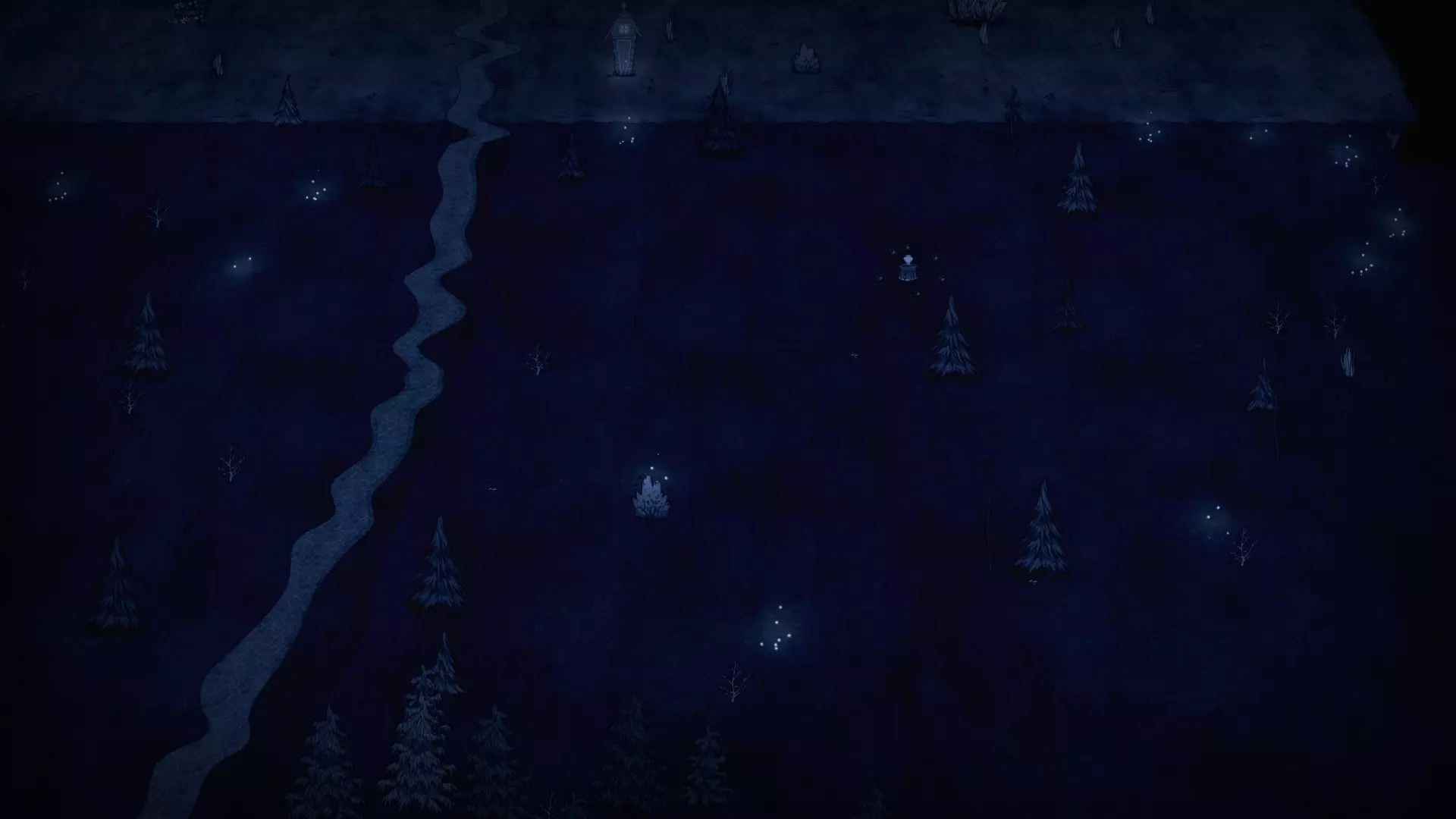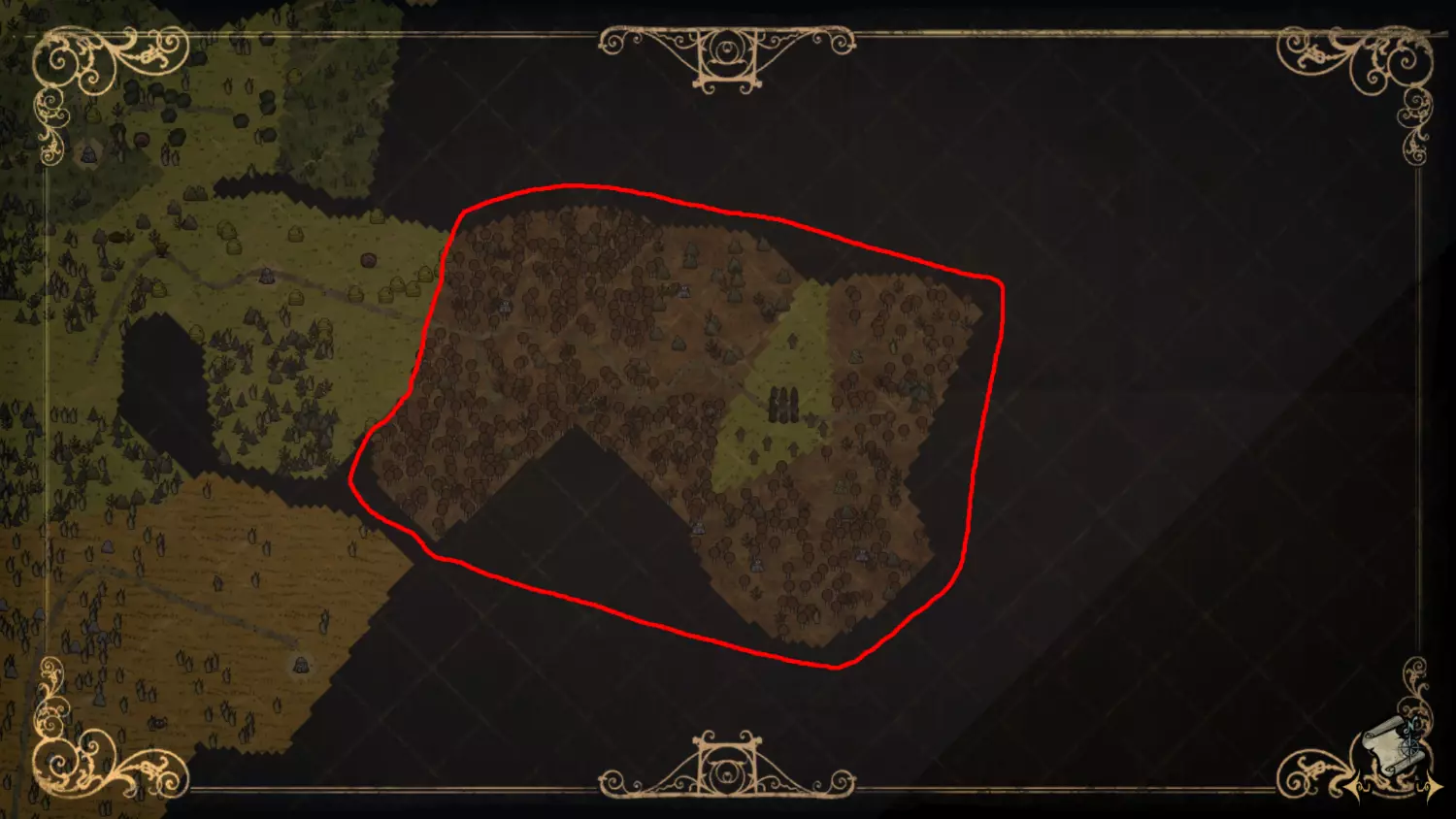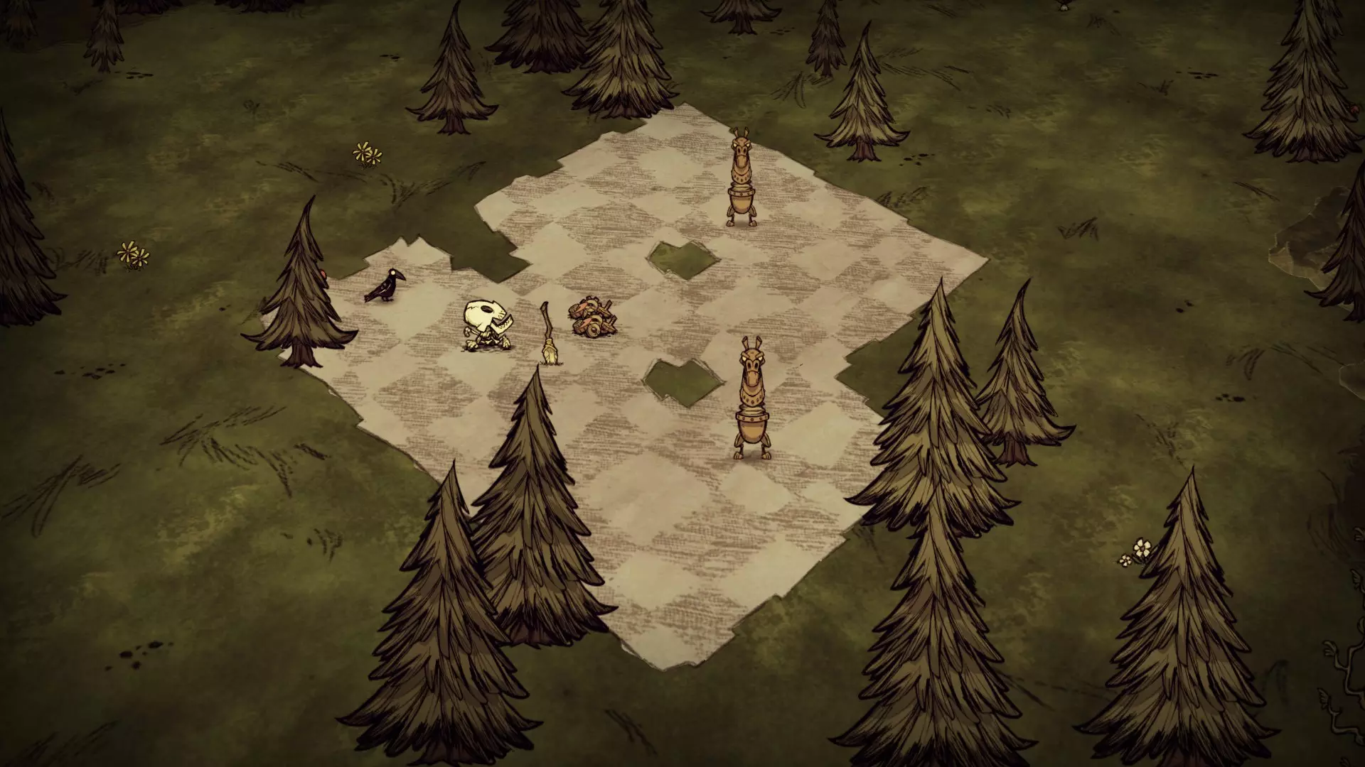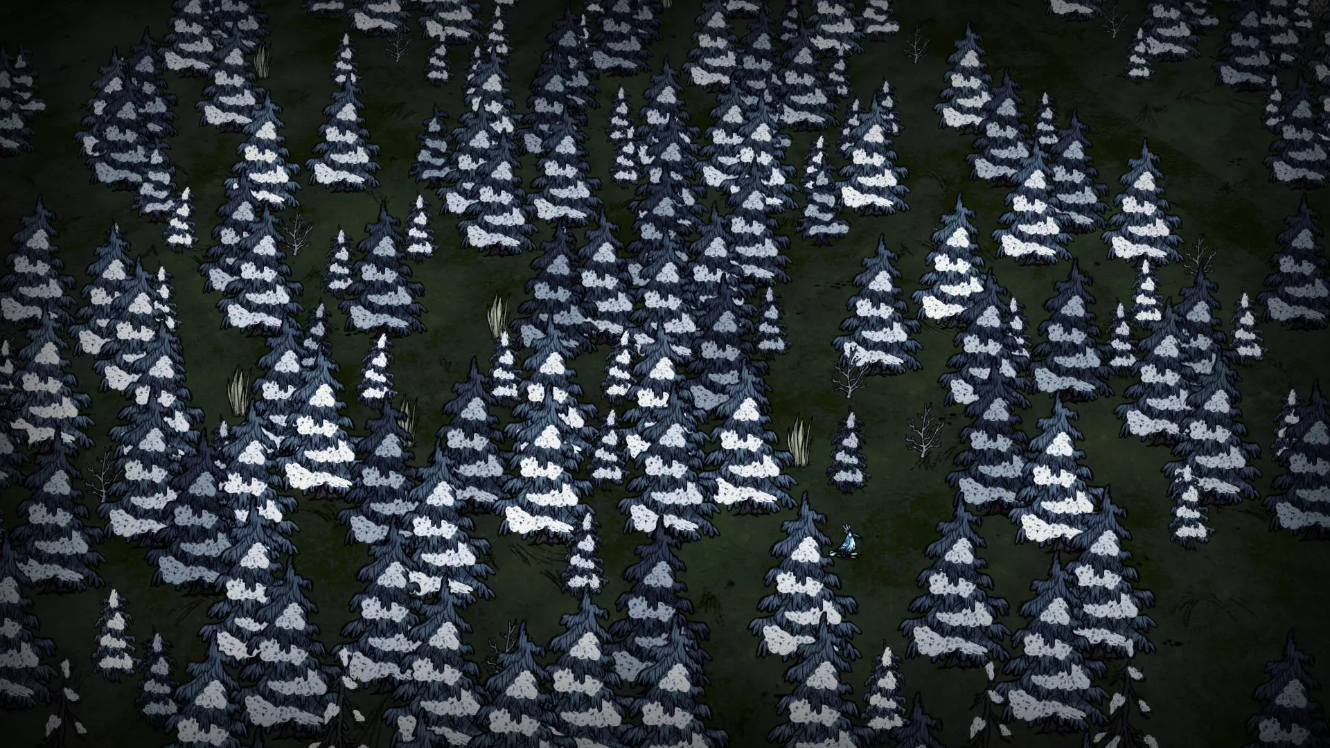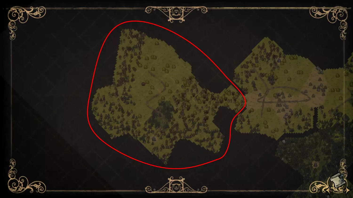 森林区域占据了整个生态群落的大部分,主要包含桦树坚果树以及树苗/多枝树。花朵很常见,但胡萝卜数量稀少。这里可以找到草丛,但非常稀疏。三种蘑菇都能在这里找到,但密度比glommer雕像区域低。空心树桩(会生成浣熊猫)和猪屋并不少见。无眼鹿和/或战利品藏匿点有机会出现在这个区域。萤火虫非常常见。