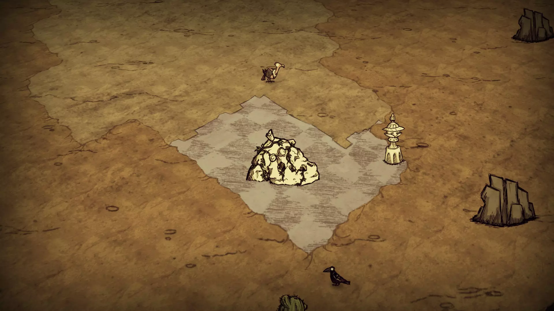 陨石区是一片以裸露地面(无地皮)为标志的区域,这里密集分布着含硝石和含金的岩石。月岩岩石可能会在这里生成,但并非一定会出现。该区域会发生流星雨,流星有几率留下石头、燧石、月岩、无燧石岩石以及含月岩的岩石。在生成了额外陨石区的世界中,可疑巨石可能会在那里生成。单个高鸟巢可能会在这里生成,但同样不保证一定会出现。 草壁虎世界 在草壁虎世界中,该生物群系中没有草。草壁虎会在岩石巢穴区域和陨石区生成。 虫洞和天坑 虫洞和天坑可能会在该生物群系中生成,但两者都不保证一定会出现。独特优势 马赛克生态群系是岩石巢穴的唯一栖息地,岩石巢穴是获取宠物以及遗弃宠物的唯一途径。 流星雨由散布在陨石区域的隐形陨石生成器引发。每次流星雨之间的间隔差异极大。每个生成器的流星雨可能每2-20天发生一次。 每次尝试生成陨石时,有60%的几率生成小型陨石,20%生成中型陨石,20%生成大型陨石。小型陨石不会掉落任何物品。中型陨石会掉落岩石、燧石或月岩。大型陨石有70%的几率生成含燧石的巨石,15%生成纯岩石巨石,15%生成月岩巨石。 每生成一个月岩巨石时,都有一定几率会生成可疑巨石。初始概率为0%,每生成一个月岩巨石,概率就会增加34%。因此,如果已生成3个月球岩巨石,下一次流星雨生成可疑巨石的概率为100%。如果世界天数超过60天,无论其他条件如何,可疑巨石的生成概率都会变为100%。 资源: 草 树苗/多枝树 浆果丛 含硝石的巨石 无燧石巨石(仅来自流星雨) 含金的巨石 月岩巨石(世界生成和流星雨) 岩石 燧石 常青树 多瘤常青树 红蘑菇、绿蘑菇和蓝蘑菇 兔子洞 鼹鼠洞穴 高鸟巢 位置: 马赛克生物群系总是与传送门生物群系相邻。独特特征 除陨石带外,马赛克生态群系的所有区域均为其特有。马赛克生态群系是唯一包含拼接地形、雾气弥漫的墓地以及岩石巢穴的地方。 绿洲沙漠 绿洲沙漠的地图视图: