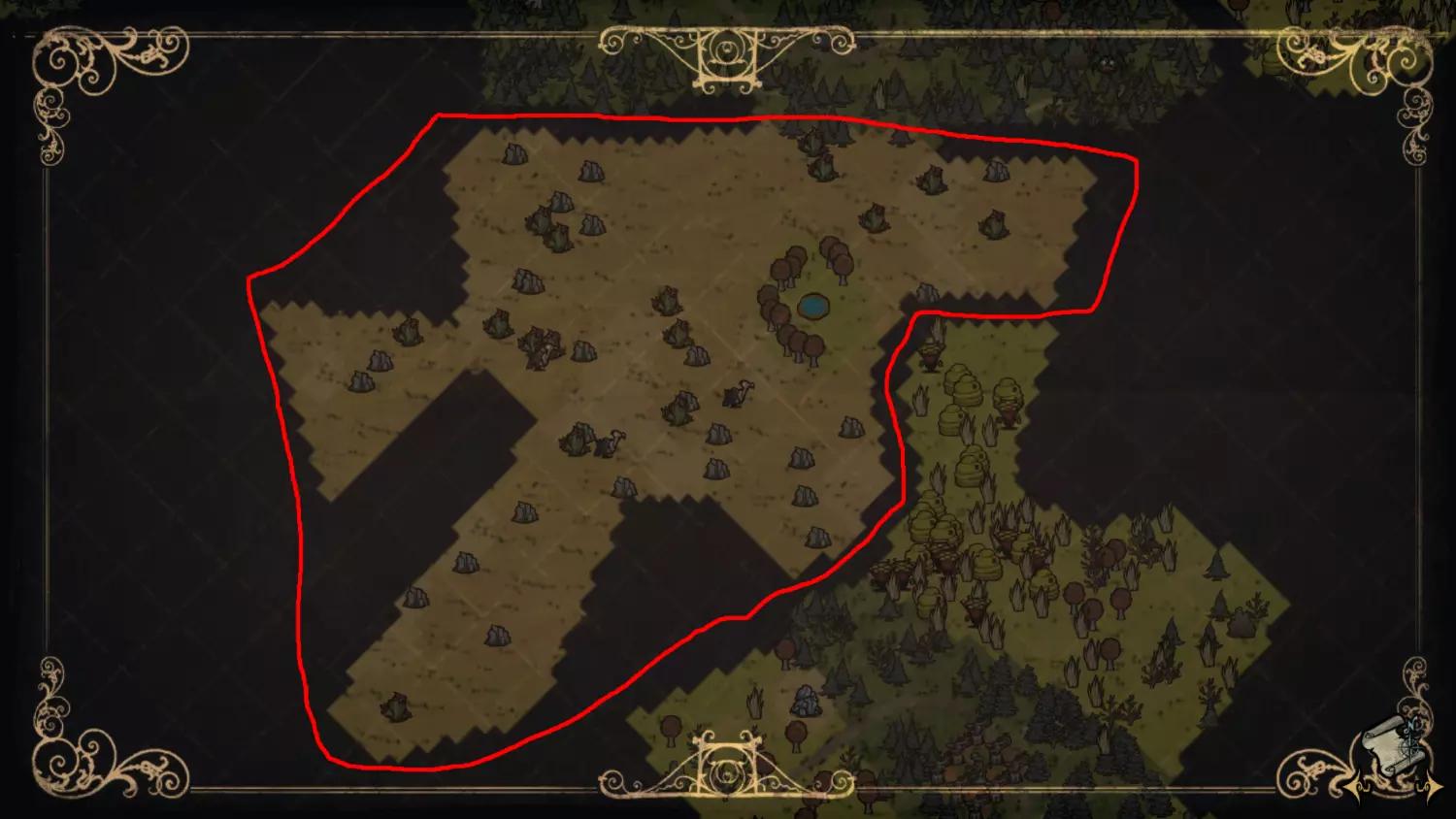 需要注意的是,本图表中仅标记了可选生成的生物群系,但同样的概念也适用于那些必定会生成的生物群系。从某种程度上来说,本指南可以看作是对其模组的补充参考资料。 世界生成 在《饥荒联机版》的常规世界生成过程中,游戏会尝试创建一个森林世界,其中包含10个必定生成的生物群系以及从10个可选生物群系中随机选取的5个(所有生物群系均在下方列出)。 命名 需要说明的一个问题是,目前并没有生物群系的“官方”名称。因此,我选择了能让每个生物群系显得突出且独特的名称。那些必定生成的生物群系的名称是我的个人想法,而可选生物群系的名称则基于T Shaw Killer所使用的名称。指南格式 每个生物群系将按以下方式组织: 生物群系地图视图 描述 - 详细讨论可用资源及其分布情况 虫洞与天坑 - 是否会生成 草壁虎世界 - 当世界生成为草壁虎世界时,该生物群系发生的变化 独特优势 - 仅在该生物群系中出现的显著物体、特征和事件 资源 - 自然生成于该生物群系的资源列表(鸟类未列出 - 详见附录) 可选建筑组合 - 仅限于该生物群系或少数生物群系的显著建筑组合列表(例如高鸟堡垒、腐烂陷阱)——列表非常不完整 显著特征——如何与其他类似生物群落区分 场景建筑 本指南对场景建筑的介绍较少,除非某个场景建筑在世界中必定生成,否则会避免提及。饥荒维基关于场景建筑的内容也不完整,但这是另一个我目前不想深入探讨的复杂问题。 排序 本指南中的生物群落按字母顺序分为以下两个主要部分: 1. 必定生成的生物群落 蜂后 龙蝇沙漠 曼德拉草森林 月面森林 马赛克地形 绿洲沙漠 猪王 传送门 沼泽 稀树草原 2.可选生物群系 额外落叶林 额外陨石区 青蛙与昆虫区 青蛙池塘 杀人蜂区 猪村森林 四驼鹿蛋区 岩石地 蜘蛛采石场 三麦克Tusk区 月岛生物群系 “旧神归来”更新中的新生物群系暂未包含在本指南内。 蜂后 典型的蜂后生物群系: