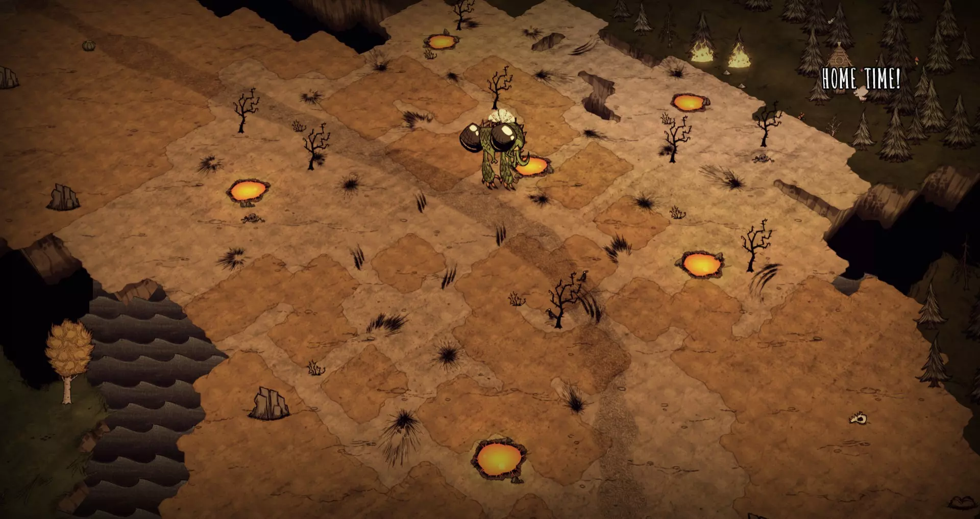 蚁狮仅在沙暴肆虐时出现。若开始下雨,沙暴会停止,蚁狮也会在降雨期间消失。如果雨在夏季结束前停止,沙暴和蚁狮将重新出现。 湖泊可以钓出皱巴巴的包裹,其中包含以下战利品: 硬化橡胶塞 戈德结 融化的弹珠 不匹配的纽扣 土豆杯 沙滩玩具 时尚护目镜蓝图 沙漠护目镜蓝图 盆栽多肉蓝图 仅在冬季盛宴活动期间: 节日装饰球 节日彩灯 每年夏季开始时,如果湖泊上方没有萤火虫,会再生三只萤火虫。如果湖泊周围没有多肉植物,也会再生18株多肉植物。在此生物群系中仅能找到1-2群伏特山羊。蚁狮是夏季周期性事件的源头,这些事件会在地表以天坑的形式出现(不要与同名的洞穴入口混淆)。