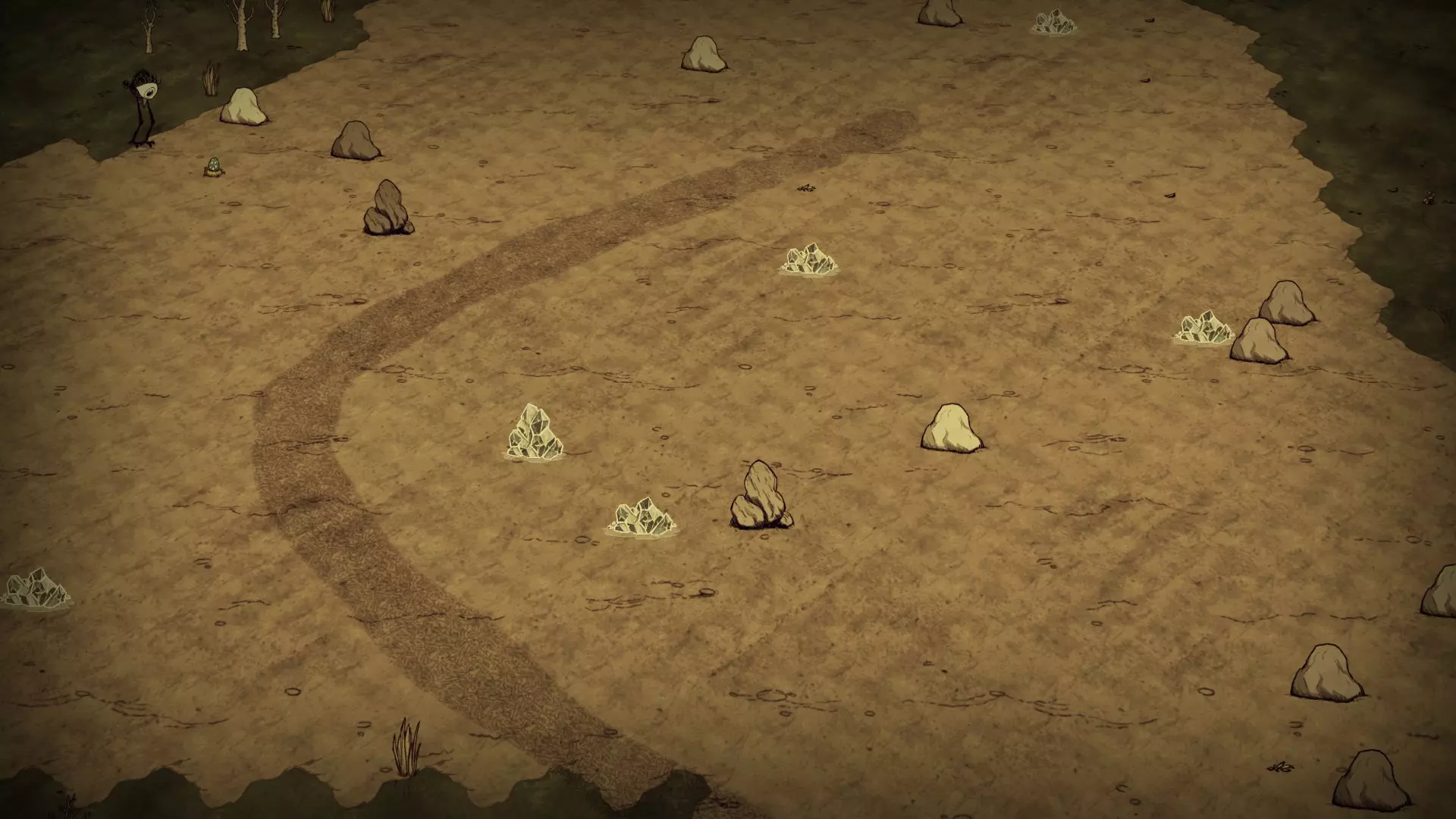 该生物群系规模相对较小,仅包含与传送门、蜂后、杀人蜂、青蛙与虫子以及额外陨石生物群系相似的草原地形。地形包含常见的草、树苗/多枝树、胡萝卜、花朵、桦树坚果、常青树和燧石。这里的浆果丛数量略多。目前仅发现蓝色蘑菇,且并非一定会生成。鼹鼠洞穴以及不属于驼鹿池塘建筑的青蛙池塘也是如此。 虫洞和天坑:在此生物群系中未发现虫洞或天坑。 草壁虎世界:在草壁虎世界中,此生物群系中没有任何草,草壁虎也不会在此生成。独特特性 四驼鹿蛋生物群系是除了更常见的驼鹿池塘地形外,唯一存在驼鹿巢的生物群系。 资源 草 小树苗 桦树坚果树 常青树 胡萝卜 花 蓝蘑菇 鼹鼠洞穴 青蛙池塘 驼鹿巢 显著特征 四驼鹿蛋生物群系在地图外只能通过存在不依附于青蛙池塘的驼鹿巢来可靠识别。在更明显的情况下,该生物群系表现为一片草地地形,位于不含此类地形的生物群系内部或旁边。 岩石地 典型的岩石地生物群系: