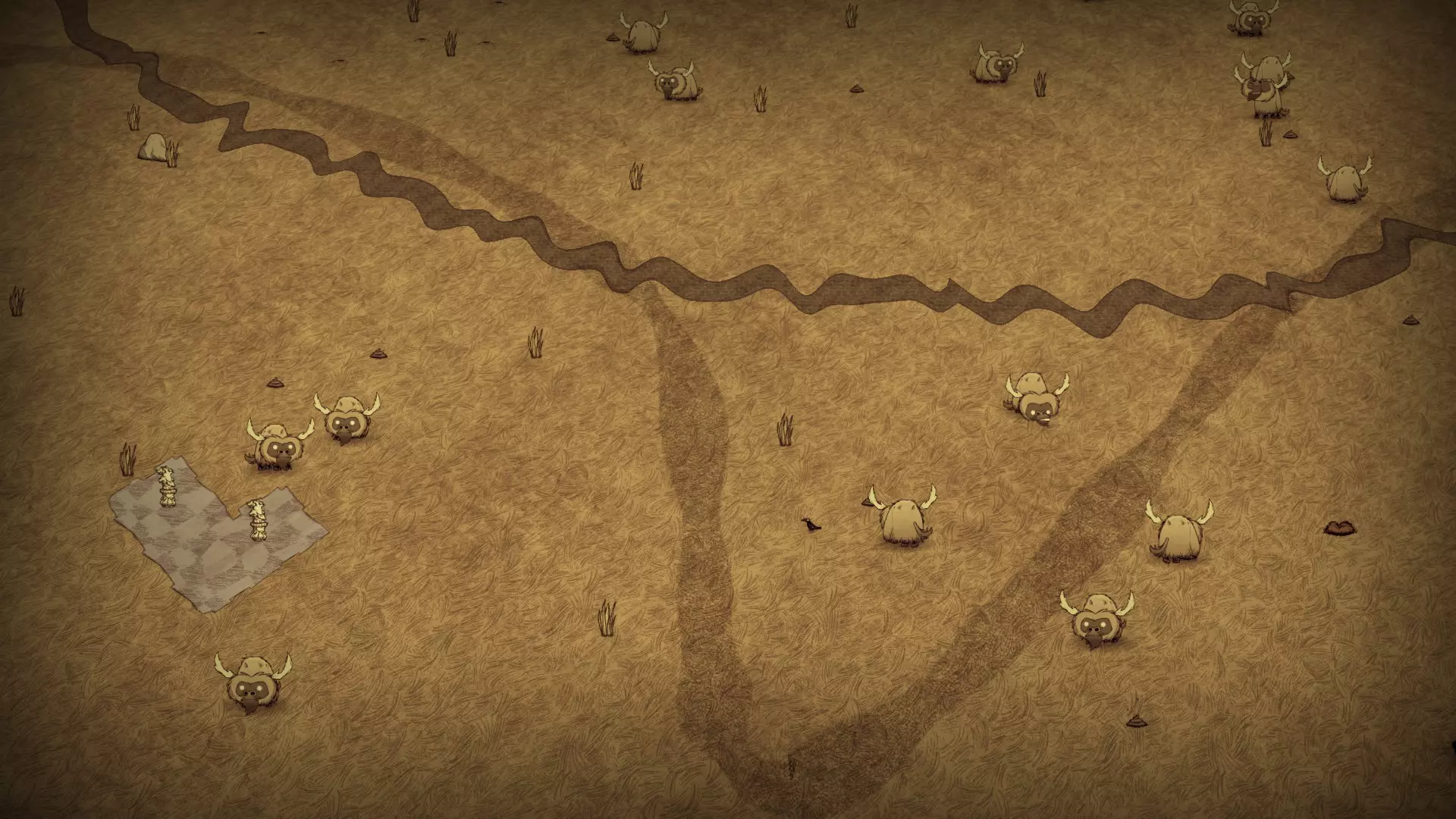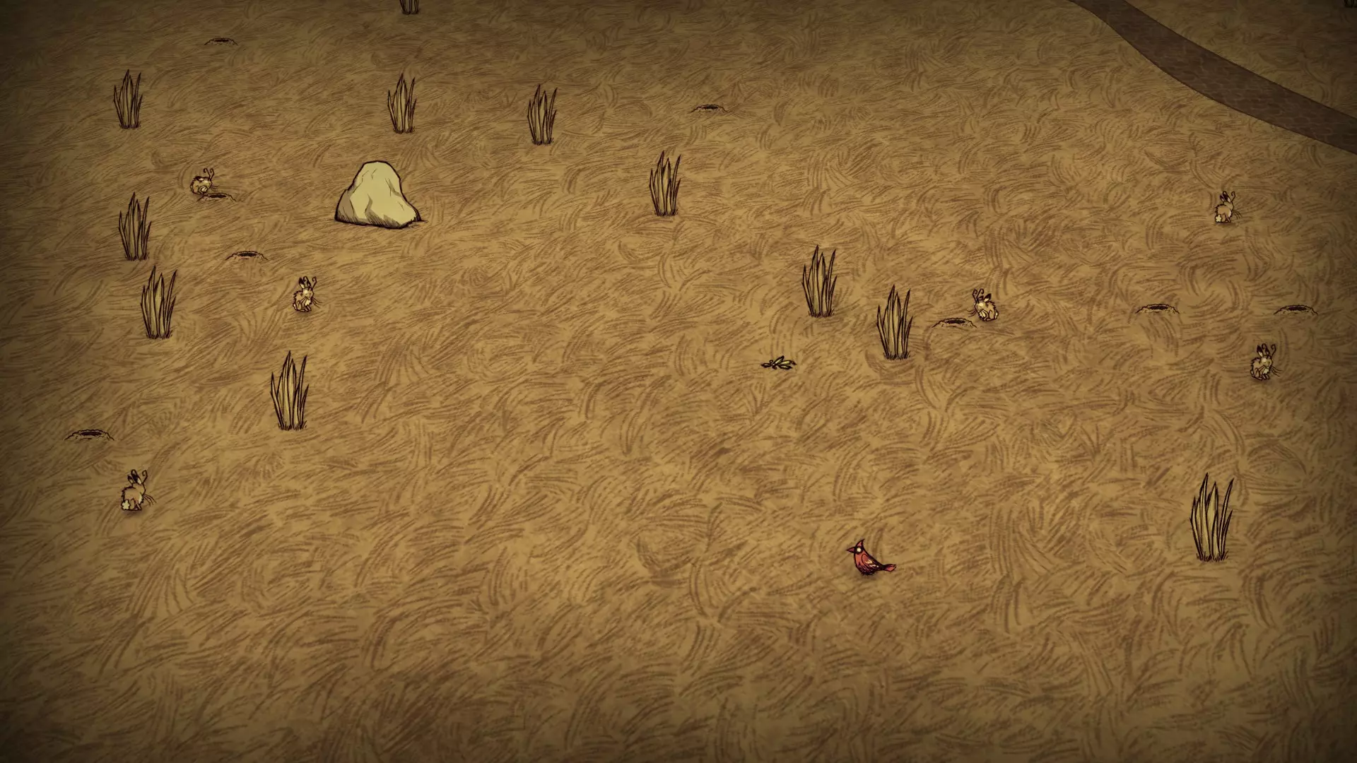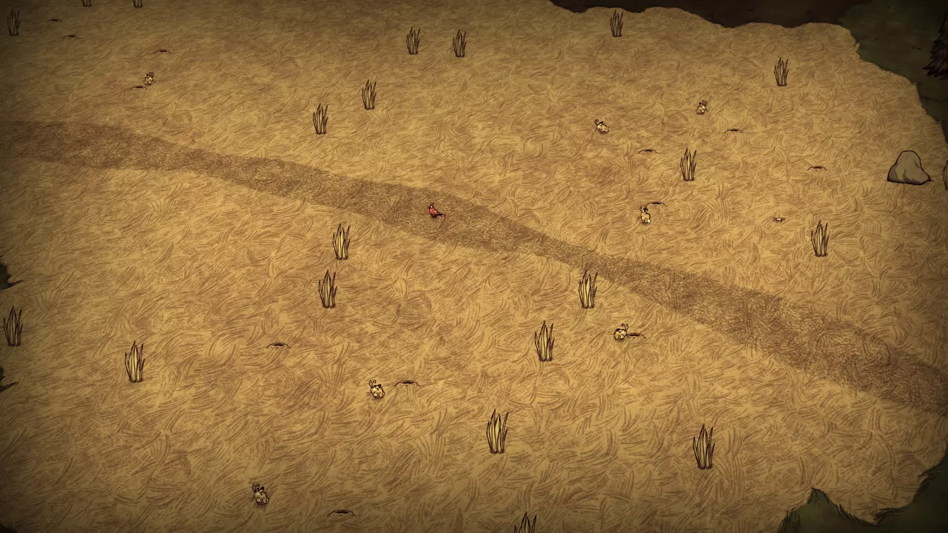 兔子领域占据了该生物群系的大部分区域,这里的草丛密度是最高的。兔子洞数量众多,而含硝石的巨石和花朵则较少。在这里可以找到绿蘑菇,但并非总是能遇到。 野牛领域: