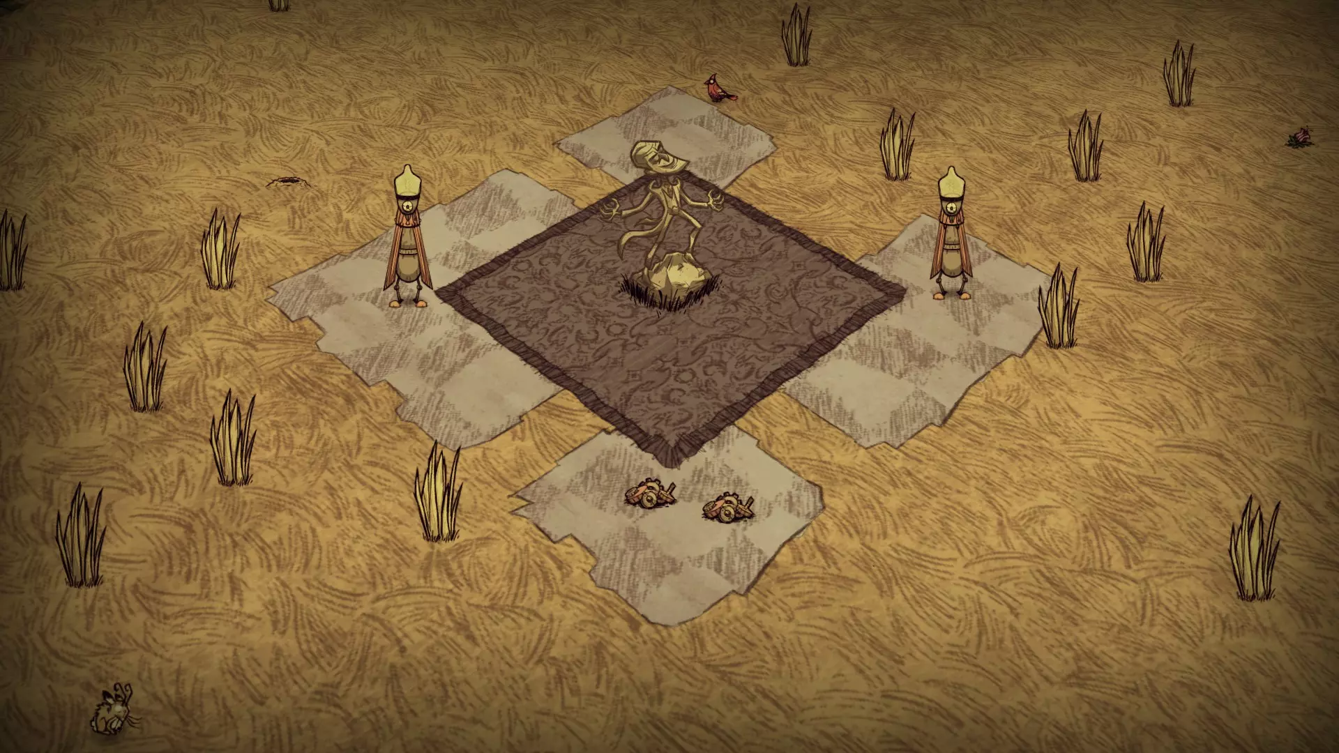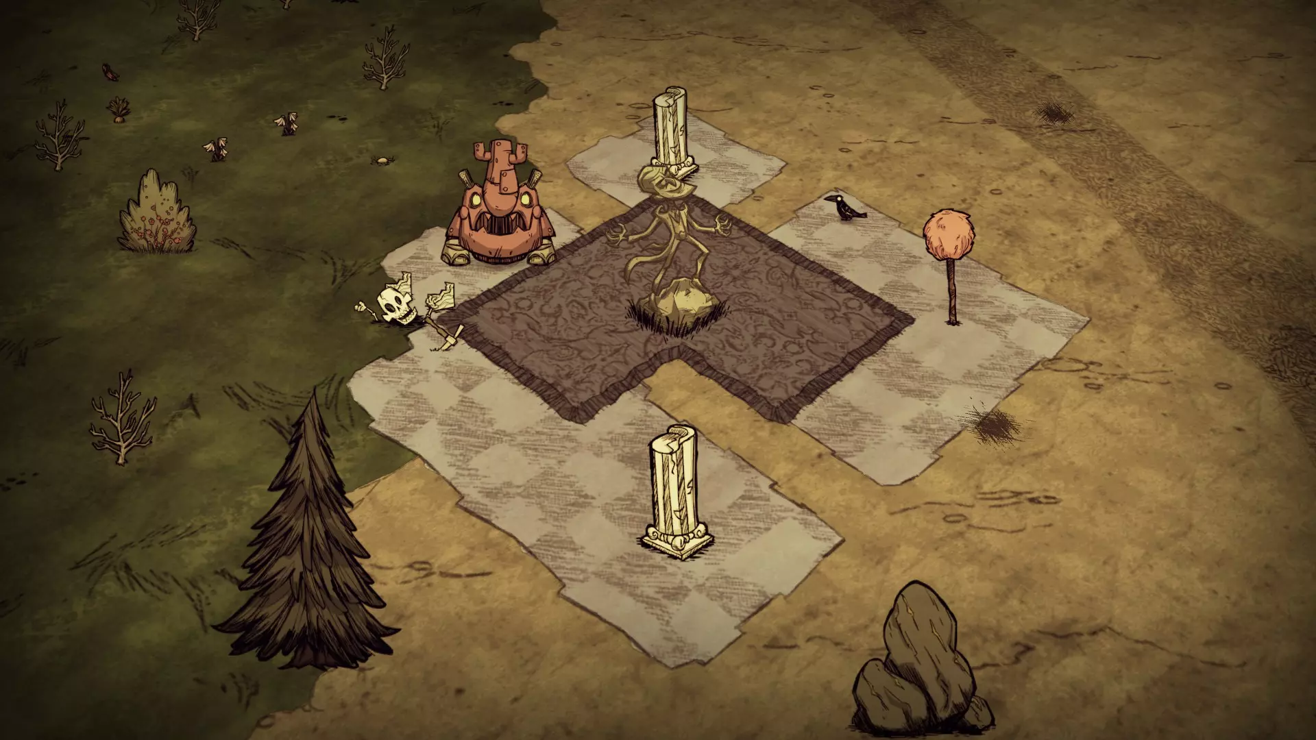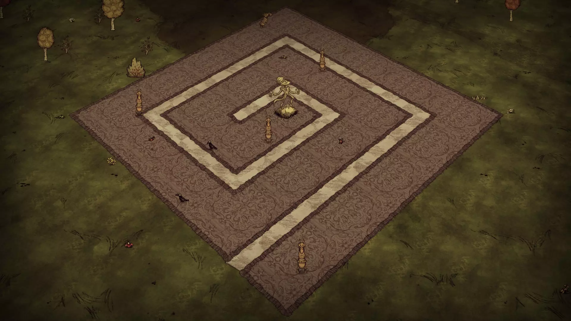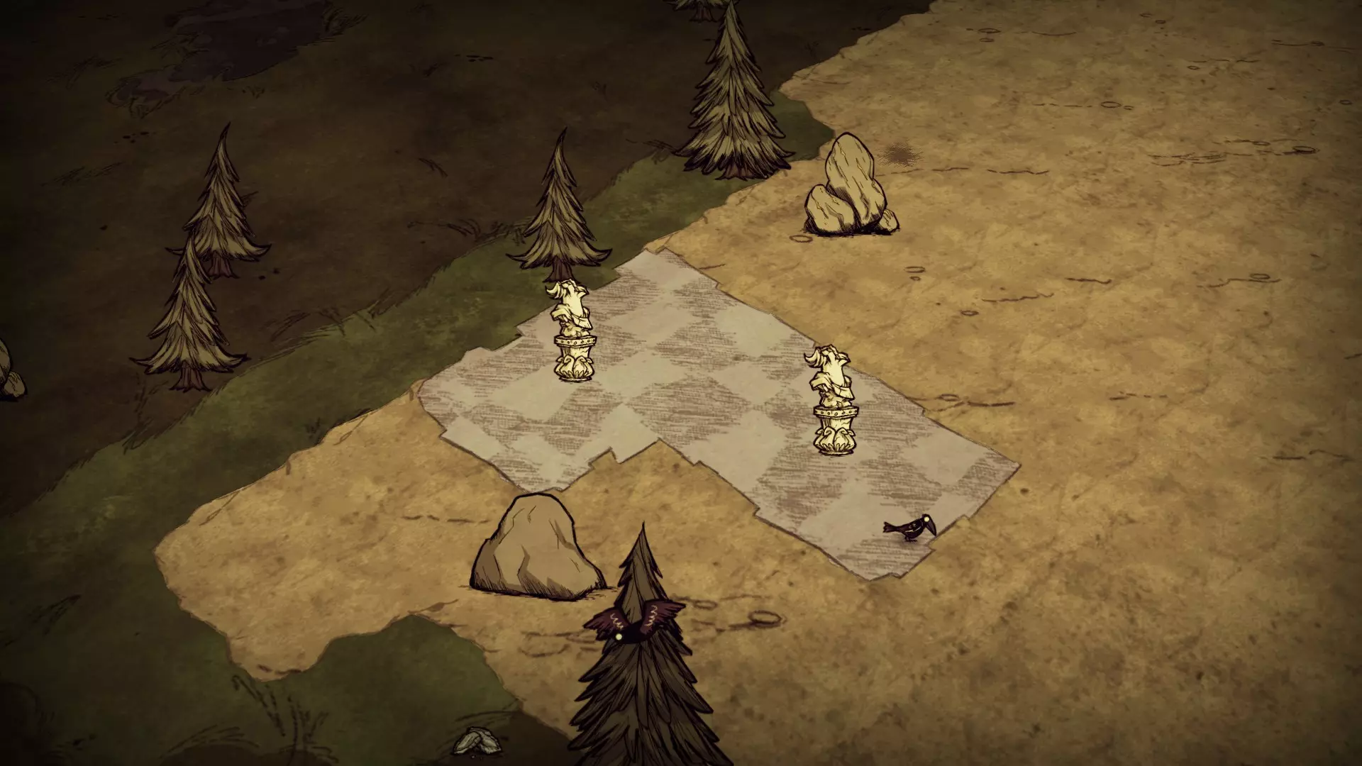 贫瘠森林由稀疏的常青树、树苗和细枝树组成。浆果丛和草类十分罕见。这里可以找到红蘑菇,但生成概率极低。萤火虫仅在此生物群系区域出现。猪房在此区域生成概率也很低。 虫洞和天坑:虫洞和天坑都可能在此生物群系生成,但都不是必然出现的。 草壁虎世界:在草壁虎世界中,草类只能在稀树草原区域找到。如果稀树草原中生成了繁花区域,那么该区域将不会有草类。草壁虎在岩石区域生成。资源 草 树苗/多枝树 浆果丛 胡萝卜 花 红蘑菇 燧石 常青树 含硝石的巨石 含金的巨石 海象营地 蜘蛛巢穴 兔子洞 猪房 青蛙池塘 显著特征 三海象可以通过岩石和热带草原地皮上的海象营地轻松识别。月森林中的海象营地只生成在草地皮上。岩石地形不含岩石,而岩石地 biome 则含有岩石。蜘蛛巢穴只在蜘蛛 quarry 的岩石地形上生成。 附录 关于鸟类 由于我列出了每个 biome 的资源,鸟类值得特别说明。它们的出现取决于当前存在的地皮。由于地皮可以被移动和替换,因此将鸟类分配到特定 biome 并不准确。因此,我在此快速说明一下鸟类相关内容。秃鹫是个例外,它们与特定生物群系中生成的实际生成器相关联,因此这里不做讨论。 游戏中有四种鸟类:乌鸦、红衣鸟、雪鸟和金丝雀。鸟类的生成行为基于当前的地皮类型: 乌鸦/金丝雀:除草地地皮外的所有地皮。 红衣鸟/蓝鸟:草地、森林、热带草原地皮。 在友好稻草人周围3个地皮半径范围内,金丝雀会取代乌鸦。如果稻草人周围区域全是草地地皮,则不会生成金丝雀。红衣鸟在秋季、春季和夏季生成,冬季则会被雪鸟取代。移除地皮并重新铺设会影响鸟类的生成行为。例如,如果你希望在岩石地生态群系中生成红衣鸟,只需铺设上述三种它们会生成的地皮中的任意一种。相反,如果你想限制只生成乌鸦,只需移除这些地皮。一个例外情况:如果在两种季节性鸟类的有效地皮外有种子,它们可能会在通常无法生成的地皮上出现。 晴天时,每5-15秒生成一只鸟。装备羽毛帽后,鸟类数量上限从4只增加到7只,且每2-10秒生成一只鸟。下雨时,鸟类生成频率是平时的4倍,而下雪不影响生成速率。 无雨 下雨 最大鸟类数量 无羽毛帽 5-15秒 1.25-3.75秒 4只75秒 4 羽毛帽 2-10秒 0.5-2.5秒 7 发条生物群系有11个生成发条生物的地形结构。每个世界会在随机位置生成1-5个此类结构。