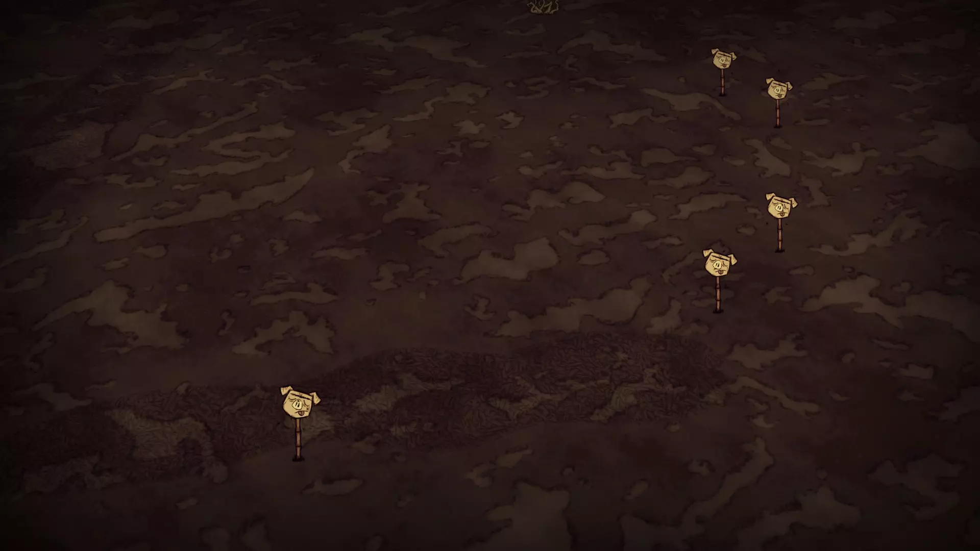 该生物群系同样没有饥荒沙漠中常见的多刺树,也没有在草壁虎世界中生成的草壁虎。绿洲沙漠也不包含稀树草原地块。当两种沙漠相邻时,可以利用沙尘暴的存在来标记两个生物群系之间的边界。 猪王生物群系 猪王生物群系的地图视图: