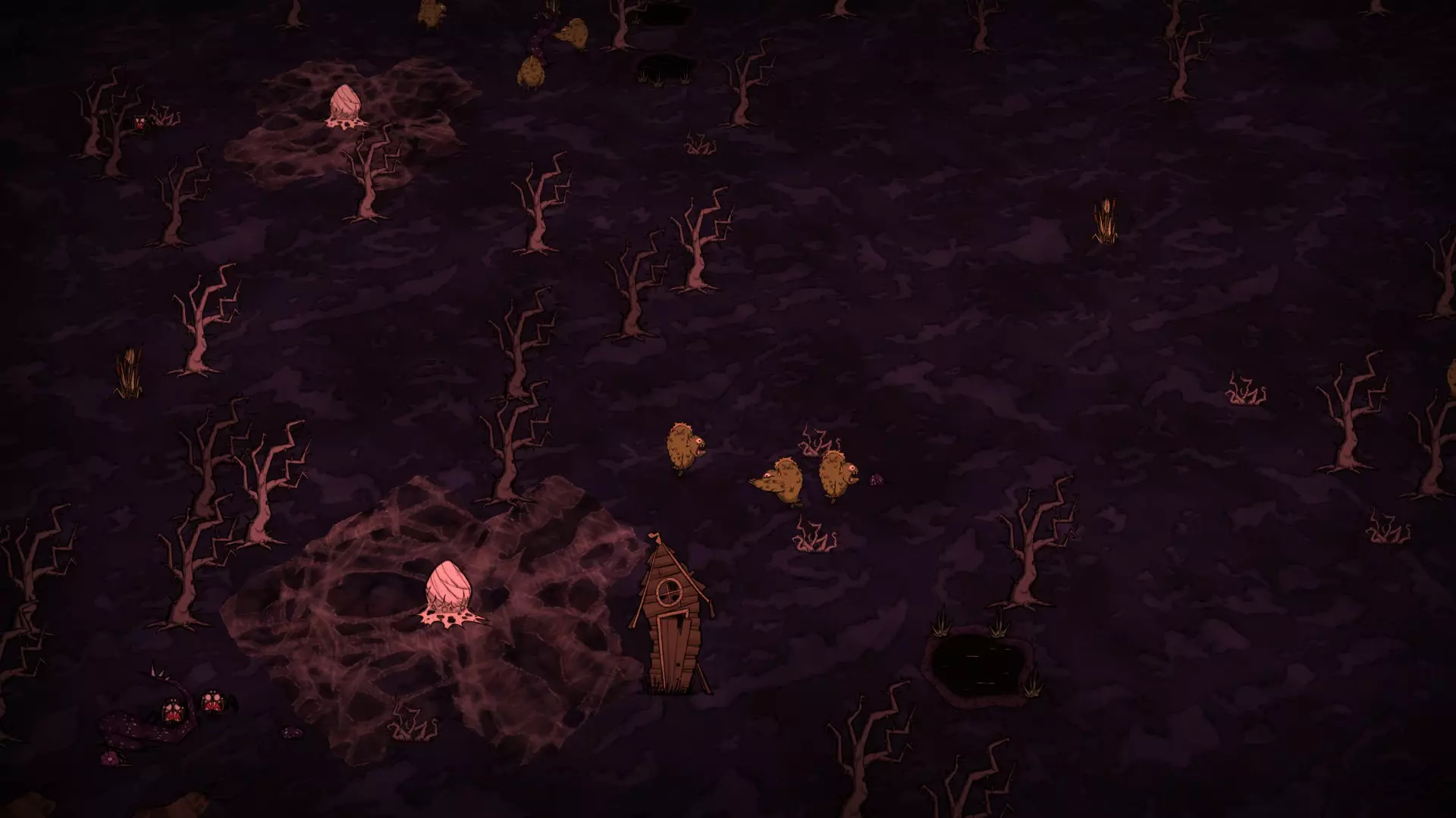 迷你沼泽与沼泽生物群系中的芦苇地完全相同。该区域仅包含芦苇、滋生蚊子的池塘、触手以及常青树。【眼骨】有几率在此处生成。 萤火虫领域: