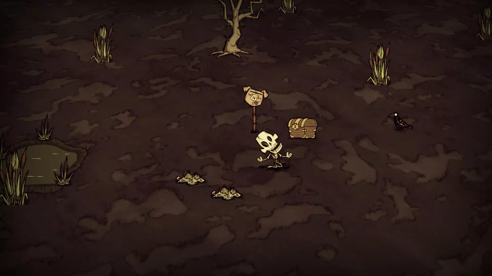 猪村由猪房、浆果丛以及9个一组的以下任意资源组成:胡萝卜、花朵、草和浆果丛。这里是唯一会生成鱼人头的地点。 迷你沼泽: