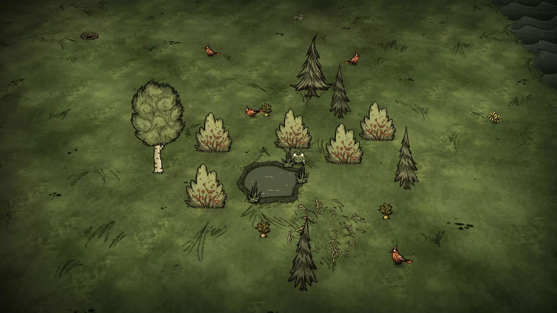 森林中稀疏分布着常青树、树苗和细枝树。这里可能会生成浆果丛和蜂巢,但并非一定会有。萤火虫可以在该区域找到。舞台助手总会在这里出现。 虫洞和天坑:这里可能会生成虫洞,但并非一定会有。该生物群系总是会有一个天坑。 草壁虎世界:在草壁虎世界中,整个生物群系都没有草。草壁虎不会在这里生成。 独特优势:当该生物群系存在时,眼骨和舞台助手总会在这里生成。资源 草 树苗/多枝树 浆果丛 胡萝卜 花 红、绿、蓝蘑菇 岩石 燧石 常青树 桦树坚果树 池塘 兔子洞 鼹鼠虫洞穴 蜘蛛巢穴 蜂巢 萤火虫 眼骨 舞台工作人员 显著特征 青蛙与虫子生物群系和青蛙池塘生物群系相似,但包含一片草原区域。青蛙池塘生物群系中的池塘群最多生成14个池塘,而青蛙与虫子生物群系中的池塘群生成数量仅为其一半。 杀人蜂 杀人蜂生物群系的地图视图: