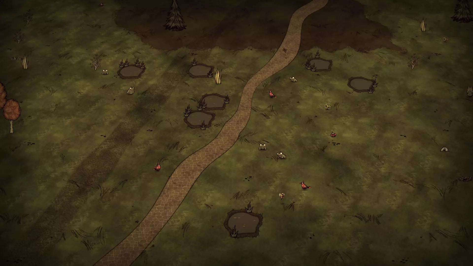 池塘区域被草皮覆盖,包含12-16个青蛙池塘。这里可以找到草、树苗/多枝树和花朵。有时,这些池塘群会分成两组。 贫瘠森林: