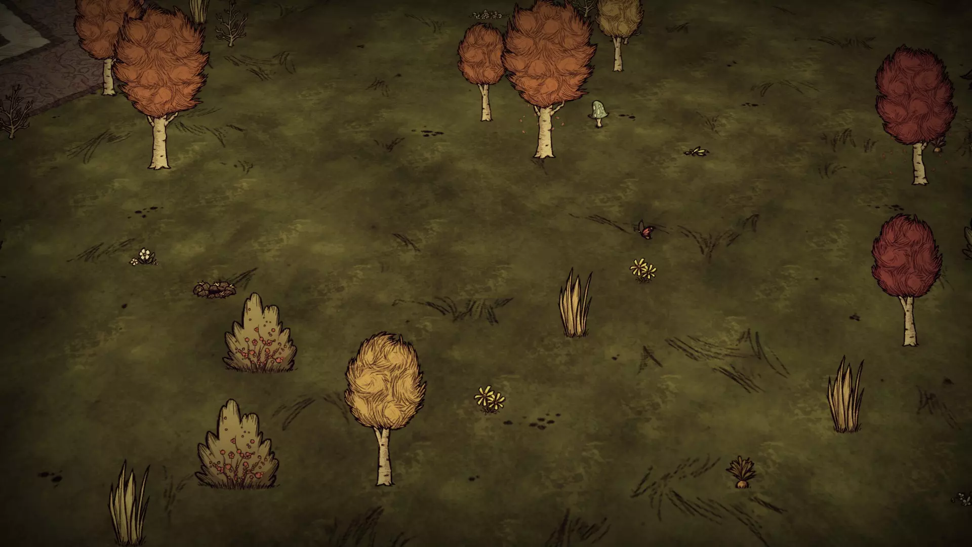 草原覆盖着草皮,这里的资源与传送门生物群系草原中的资源相同。可以找到草簇、树苗/多枝树、浆果丛、胡萝卜、花朵、燧石、所有三种蘑菇、桦树坚果树和常青树。蜂巢和蜘蛛巢穴可能会在这里生成,但并非一定会出现。还能在这里发现兔子洞、鼹鼠虫洞穴和青蛙池塘。 森林: