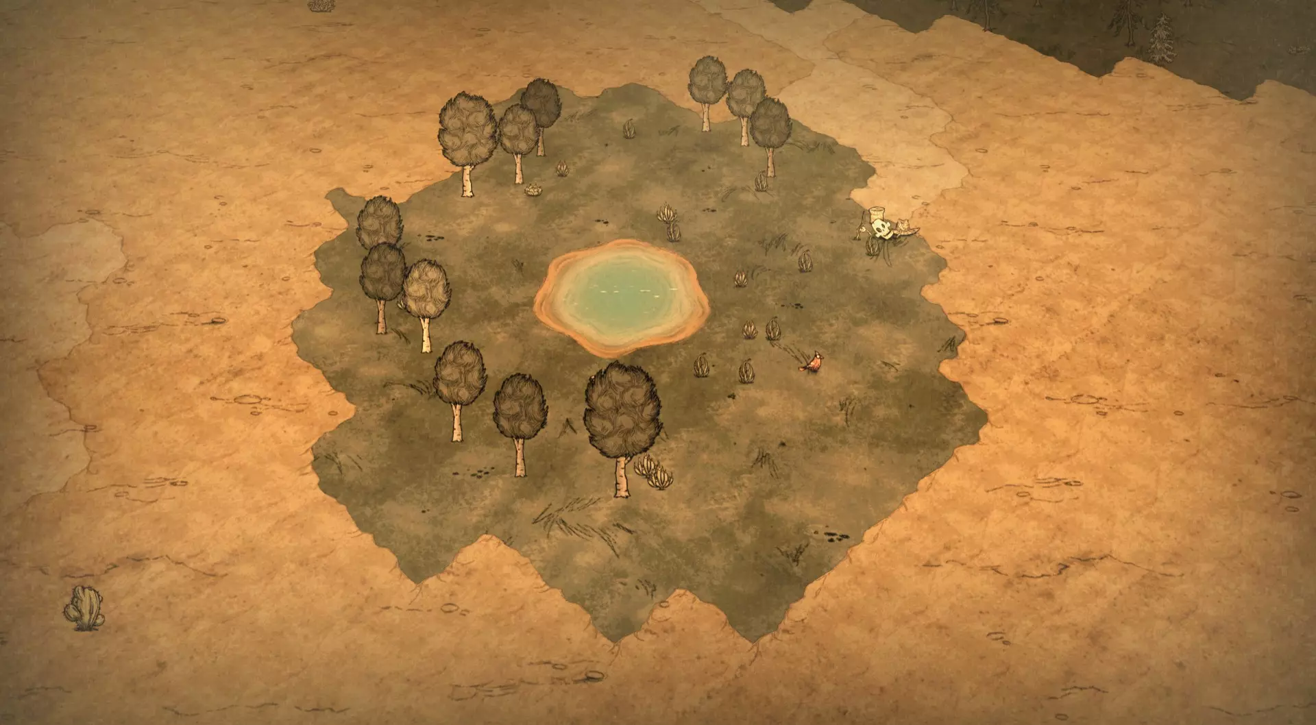 这个场景还包含10棵桦树坚果树,以及一具戴着草帽、拿着草卷和鱼竿的骷髅。整个场景生成时方向固定;上面的截图显示的是绿洲朝北时的样子。每个夏季沙尘暴开始时,如果湖泊上方没有萤火虫,就会生成三只萤火虫。该场景是这个生物群系中唯一受沙尘暴致盲效果影响最小且不会降低移动速度的区域。 沙漠: