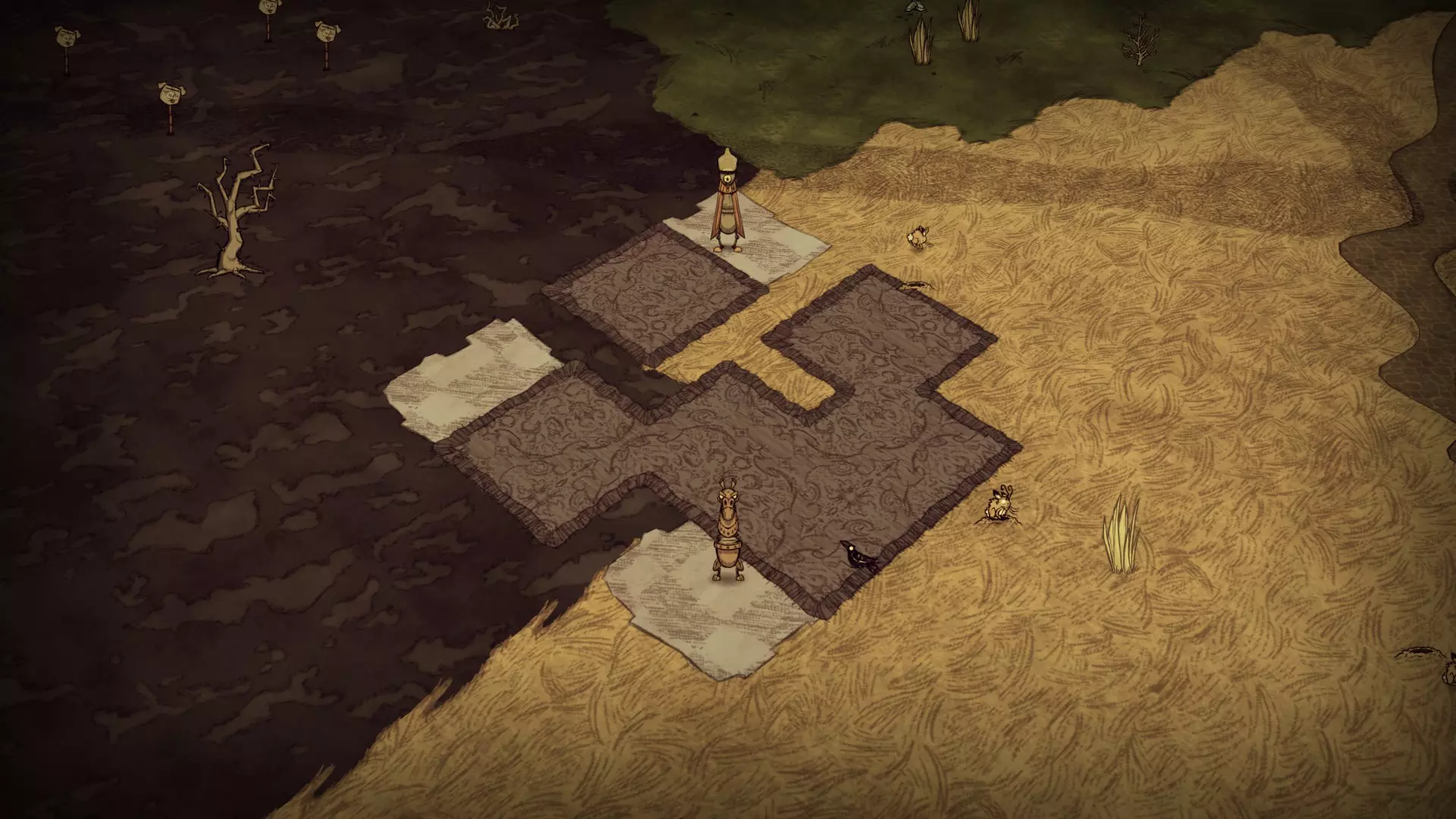 资源:芦苇、多刺树和多刺灌木、常青树、破旧房屋、蜘蛛巢穴、触手、猪头 可选建筑:芦苇陷阱、腐烂陷阱 显著特征:沼泽生物群系是唯一在沼泽地皮上生长多刺树和多刺灌木的区域。猪村生物群系有与芦苇地相同的区域,但没有多刺树和多刺灌木。 稀树草原 典型的稀树草原生物群系: