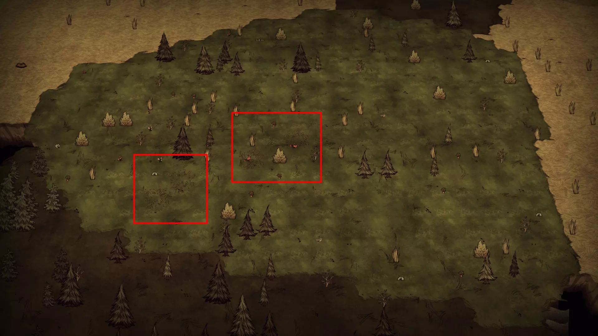 稀疏森林是包含相对较少常青树和多瘤常青树的区域。该森林可能只生成常青树,也可能只生成多瘤常青树。这里仅有的其他资源是树苗/多枝树、草和萤火虫。稀疏森林并非一定会生成。 虫洞和天坑:此生物群系中可能会生成天坑和虫洞,但两者都不是必定生成的。 草壁虎世界:在草壁虎世界中,整个生物群系(包括野牛平原)都没有草。这里也不会生成草壁虎。资源 草 树苗 含燧石的岩石 含金的岩石 常青树 多瘤常青树 浆果丛 花朵 完全正常的树 邪恶之花(在完全正常的树附近) 红、绿、蓝蘑菇 萤火虫 蜘蛛巢穴 猪人房 坟墓 青蛙池塘 可选建筑组件 被囚禁的猪人