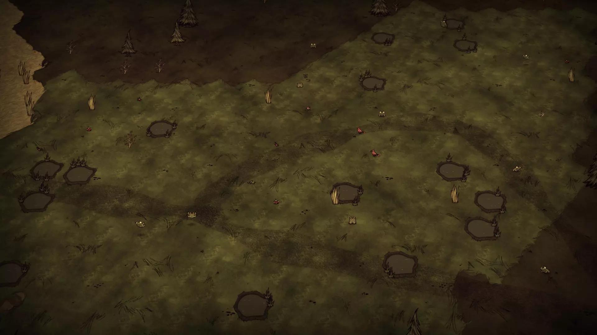 森林区域生长着树苗/小枝树、常青树和多瘤常青树。这里也是该生物群系中唯一能找到萤火虫的地方。红蘑菇和绿蘑菇会在此区域生长,但数量不多。草和浆果丛也相对稀少。这里可能会生成猪房,但并非一定会有。 草丛壁虎世界:在草丛壁虎世界中,草原和森林区域的所有草丛都将消失,唯一的草只能在稀树草原区域找到。草丛壁虎不会在该生物群系中生成。 天坑和虫洞:天坑和虫洞都可能在该生物群系中生成,但并非一定会有。资源: 草丛簇 树苗和多枝树 燧石 浆果丛 胡萝卜 花朵 红、绿、蓝蘑菇 常青树 多瘤常青树 含硝石的巨石 兔子洞 鼹虫洞穴 位置: 传送门生物群系总是进入世界后遇到的第一个生物群系。马赛克生物群系总是与此生物群系相连。 沼泽 沼泽生物群系的地图视图: