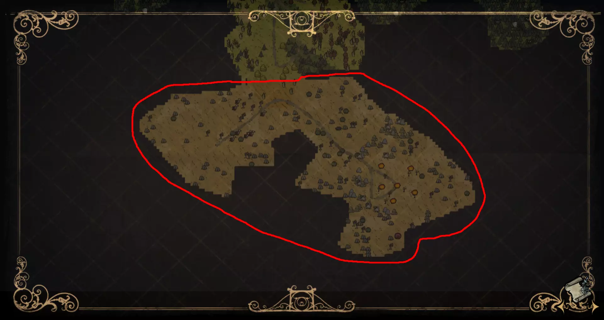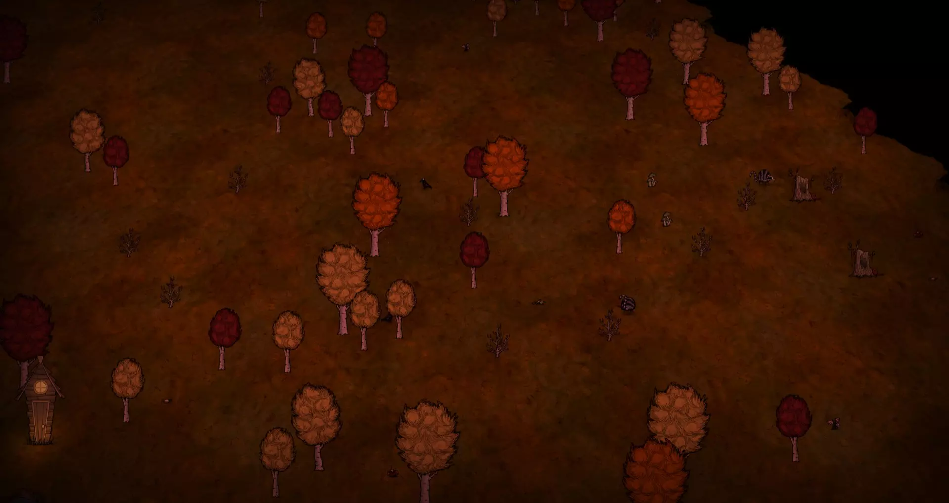该森林中只生长桦树坚果树。树苗/多枝树以及所有三种蘑菇在此处较为常见。草簇、浆果丛、花朵、含硝石的岩石和含金的岩石则不那么常见。空心树桩和猪屋数量稀少。与猪王森林区域不同,这里的森林中有鼹鼠虫洞穴。在洞穴附近可以找到燧石。该生物群系中萤火虫数量丰富。无眼鹿和战利品藏匿点有机会出现在此生物群系中。 虫洞和天坑:此生物群系不会生成虫洞和天坑。 草壁虎世界:在草壁虎世界中,该生物群系中没有草簇。草壁虎也不会在此生成。资源 草丛簇 树苗/多枝树 浆果丛 桦树坚果树 含硝石的巨石 含金块的巨石 红、绿、蓝蘑菇 花朵 空心树桩 猪房 显著特征 额外落叶林生物群系的一个显著特征是森林区域存在鼹鼠虫洞穴。在猪王生物群系中,洞穴仅限于格洛姆雕像区域,森林中不存在。 若遇到驼鹿池塘,则可排除遇到额外落叶林生物群系的可能性,因为该场景不会在该生物群系中生成。 额外陨石(花丛和岩石) 额外陨石生物群系的地图视图: