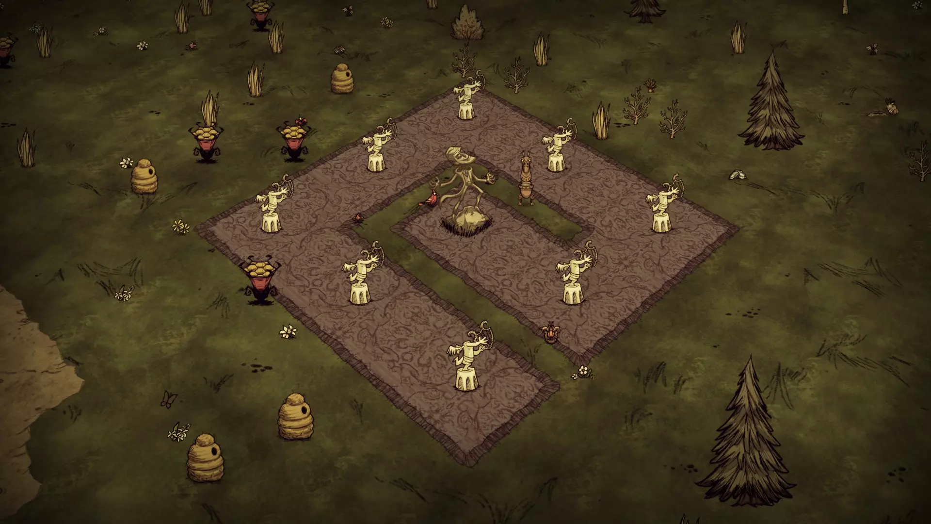 蜂后区域包含巨型蜂巢、最多两个杀人蜂巢,以及密集的花丛和浆果丛。普通蜂巢可能会在该区域生成,但并非一定会出现。 草原: