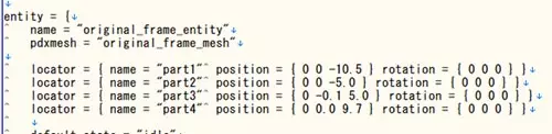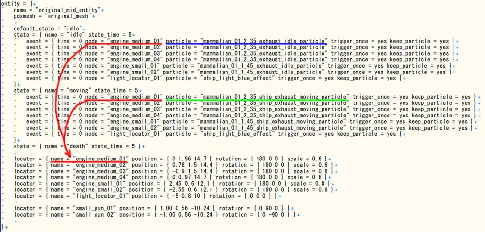我在部件上添加了引擎特效和信标灯光。 首先,通过name = "original_mid_entity"从original_section.txt的部件模板中提取部件内容。请填写关联的名称。 接下来,pdxmesh = "original_mesh"用于指定模型。 然后,和框架部分一样,从上方开始进行"停止""移动""击破"的演出效果设置。 引擎在停止和移动时会使用不同的CG模型来表现引擎启动的效果。 击破时不需要设置,因此无需填写。 本次使用的是基础游戏中名为mammalian_01_2_35_exhaust的模型。停止时 "mammalian_01_2_35_exhaust_idle_particle" 移动时 "mammalian_01_2_35_ship_exhaust_moving_particle" 请注意CG模型不同。 这种引擎效果和信标灯(图像中的"ship_light_blue_effect")在原版中有多种模型(圆形、方形、不同颜色等)。 因此,请选择适合场景的模型(gfx particles中有多种)。当然也可以自行准备! 以下定位器组用于设置上述CG模型的位置信息。 如果是未嵌入定位器的CG模型,就需要进行这项操作。不做也没关系,但这种情况下,所有位置(这里指引擎效果和武器位置)都会变成中心点(0 0 0)。 position = { 0 1.96 14.7 } rotation = { 180 0 0 } scale = 0.6 position是位置,rotation是旋转。轴为(X Y Z)。scale是大小。 对于较大的引擎喷嘴,可以通过调整scale来进行调节。 接下来是武器位置设置。 locator = { name = "small_gun_01" 请输入对应的original_section.txt中的locatorname。 可以说,这种定位器嵌入作业是舰船MOD制作中最大的难点。(至少对我来说 随意写下位置,启动游戏确认,修正,再启动游戏确认,修正…… 必须一次次启动游戏才能确认……(哭 如果有更好的方法请务必告诉我!!!!!不,难道一开始手动输入就错了吗……会编程的人能不能做一个Blender的嵌入式编码器(to mesh)啊 这样一个部分就完成了。 引擎效果设置要应用到位于最后的所有部分组。 武器位置设置要应用到所有部分。(吐血 original_meshes.gfx的概要
