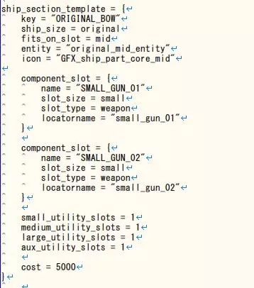 该画像为【original】舰船的【mid】组模块添加了以下性能的模板: - 武器S插槽2个 - 大中小通用插槽各1个 - 实用插槽1个 - 成本5000!? ship_sizes 适配的舰船名称(ship_sizes.txt中的ID名)。 fits_on_slot 适配的模块组名称(original_sizes.txt中所写的组名) entity 用于与后文original_entities.asset进行关联的名称 icon 舰船设计模块选择界面中显示的图像关联名称 component_slot 武器插槽的设置。・slot_size 武器尺寸(小型、中型、大型、点防御、超大型) ・slot_type 插槽类型(武器、舰载机) ・locatorname 定位器名称(用于武器位置信息的名称) ほにゃらら_utility_slots 用于设置可安装发电机、装甲、护盾等装备的插槽数量。(小型、中型、大型、辅助型) cost 建造所需矿石 每个分段都需要设置「ship_section_template =」。 如果由两个分段组构成,且每个组有3个选项,那么总共需要编写6个「ship_section_template =」。 original_entities。资源概要 舰船组装图、武器位置设定以及舰船相关的特效设置 这部分工作可能是最繁琐的。