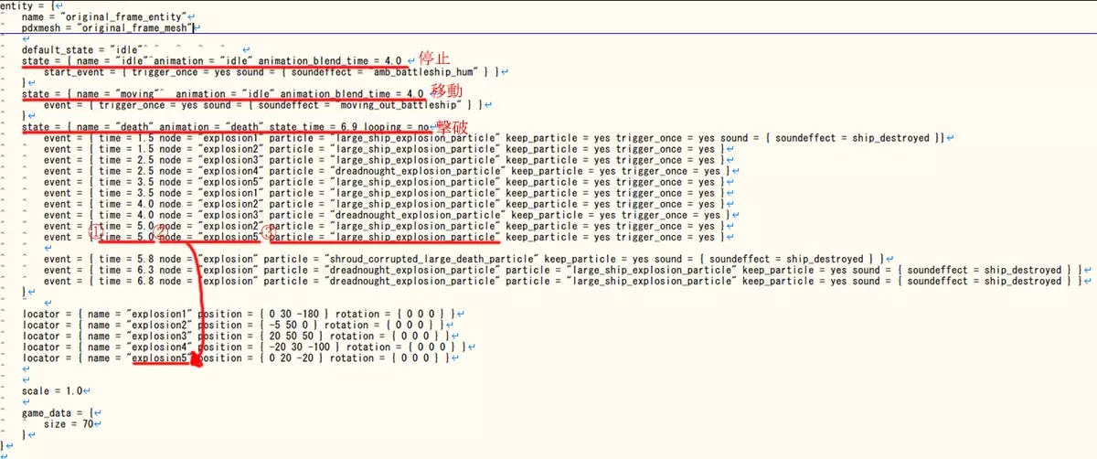 「pdxmesh = 」用于指定模型。这里指定了「original_frame_mesh」。但这仅仅是指示“将使用此名称的文件”,还必须编写用于指定实际文件位置的描述。后文的original_meshes.gfx即对应此内容。 红线标注处从上到下依次是“停止”“移动”“击破”时的演出效果设置。 name为状态名称,animation为此状态下的动画ID。 基本上请直接使用这两项。 animation_blend_time指的是过渡所需的时间。例如,如果想延长被击破时的爆炸演出,请增加state = { name = "death" 行中的animation_blend_time数值。 start_event = { trigger_once = yes sound = { soundeffect = "amb_battleship_hum" } } 这行代码用于设置该状态下的音效,也就是环境音,类似“嗡嗡嗡”的声音。如果想播放自己喜欢的音效,可以修改相关参数,但音效设置相对麻烦,所以很多人会直接使用游戏原版音效。 state = { name = "death" 之后的内容是被击破时的爆破演出设置。 ①是击破后的经过时间,在示例中表示“从HP变为0时开始,5.0秒后”。②是爆炸位置设定的ID。在箭头之后会通过position相关描述重新确定位置。关于position的详细说明将在entity章节中进行。 ③是爆炸效果的CG模型指定。 虽然未标注红线,但“sound = { soundeffect = ship_destroyed }”代表爆炸音效。此例中音效会播放4次,不过最后2次设计为几乎同时响起。这是通过叠加音效来试图增加一些音量,大概是因为准备音效文件太麻烦了吧,哈哈。 顺便一提,即使尝试让音效完全同时播放,也只会生效一个。因此时间上稍微错开了一些。 另外,关于这里的爆炸模型数量,似乎是有限制的。图片中使用了5个定位器(未设置定位器的会自动位于(0 0 0)位置)和14个模型,但恐怕只有大约一半得到了体现。 虽然有从DLC文件中调取爆炸CG的描述("dreadnought_explosion_particle" DLC利维坦),但如果没有该DLC(即基础游戏),也只会跳过而不会出现错误。 虽然我写了这么多关于爆炸的内容,但除非是非常大的舰船,否则通常不会做这么细致的调整。嗯…(困惑) 然后,将各部分组附加到框架的描述如下列图片所示。