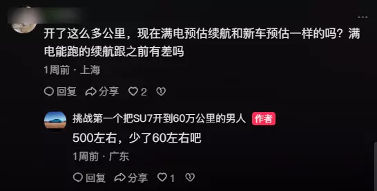 这位车主正是抖音博主“挑战第一个把SU7开到60万公里的男人”,去年底时,其提车一年多就跑出25.54万公里,登上小米汽车2025年度总结,成为品牌单车最长行驶里程纪录保持者。